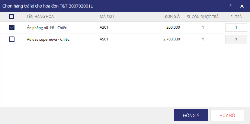 4. Chọn hàng hóa khách đổi trả, nhập số lượng hàng hóa, nhấn Đồng ý.