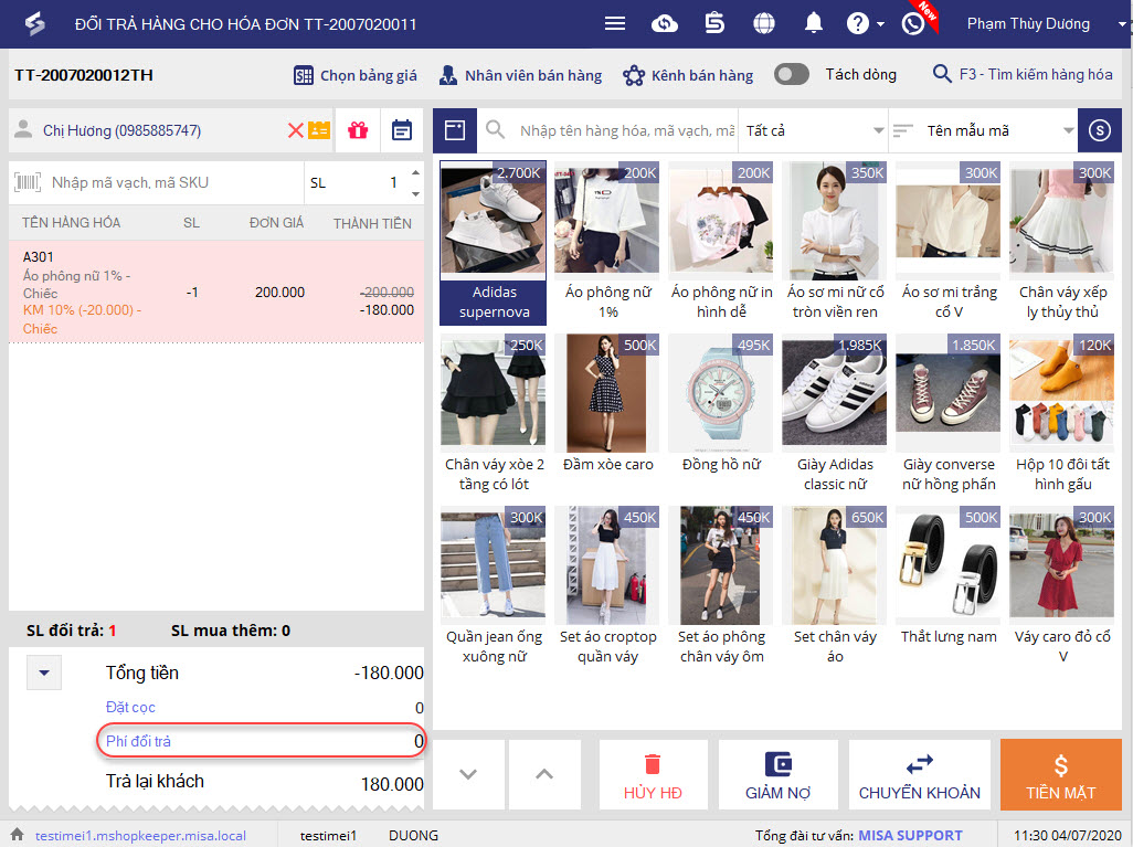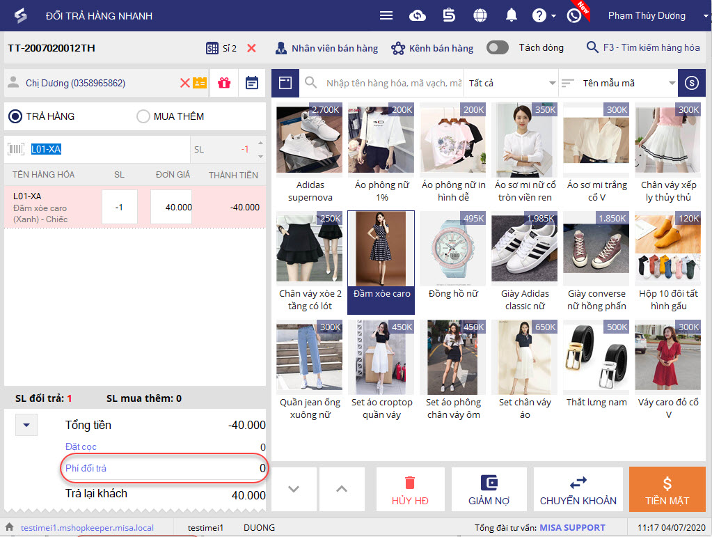 5. Nếu cửa hàng có tính phí khi khách đổi trả hàng, nhập số tiền phí tại ô Phí đổi trả.