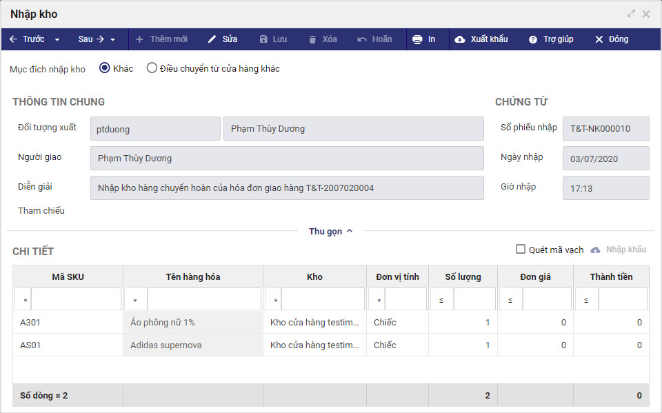 Đơn giá hàng hóa trên phiếu nhập kho sẽ được tính theo đơn giá xuất kho lần gần nhất.