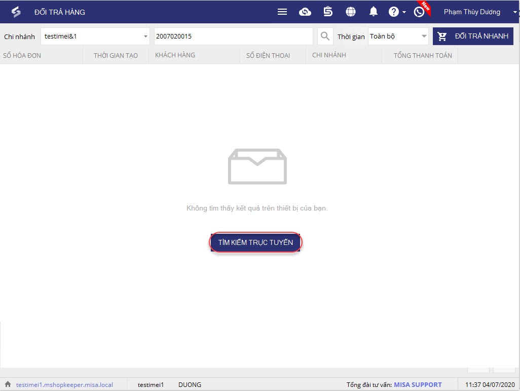 Trường hợp không tìm thấy hóa đơn, có thể do hóa đơn được lập trên 1 thiết bị khác hoặc thiết bị hiện tại đã thực hiện xóa dữ liệu. Khi đó, có thể sử dụng chức năng Tìm kiếm trực tuyến.