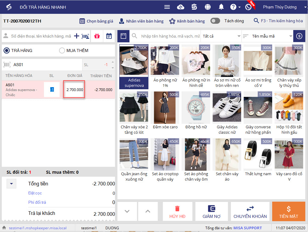 • Quản trị hệ thống, quản lý chuỗi, quản lý cửa hàng và nhân viên điều chỉnh giá bán có thể sửa nhanh đơn giá cho hàng hóa trả lại khi thực hiện đổi trả nhanh.