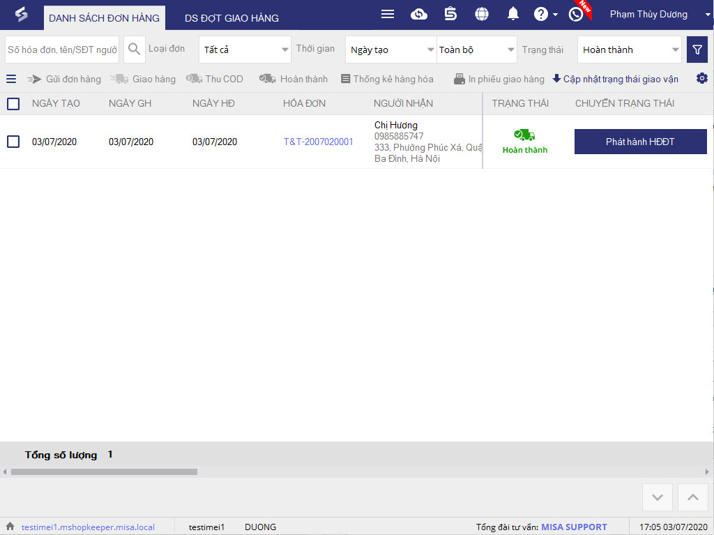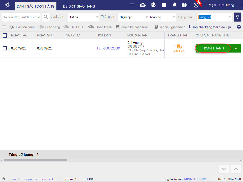1. Sau khi đã giao hàng, đơn hàng của khách sẽ chuyển trạng thái Đang giao hàng.