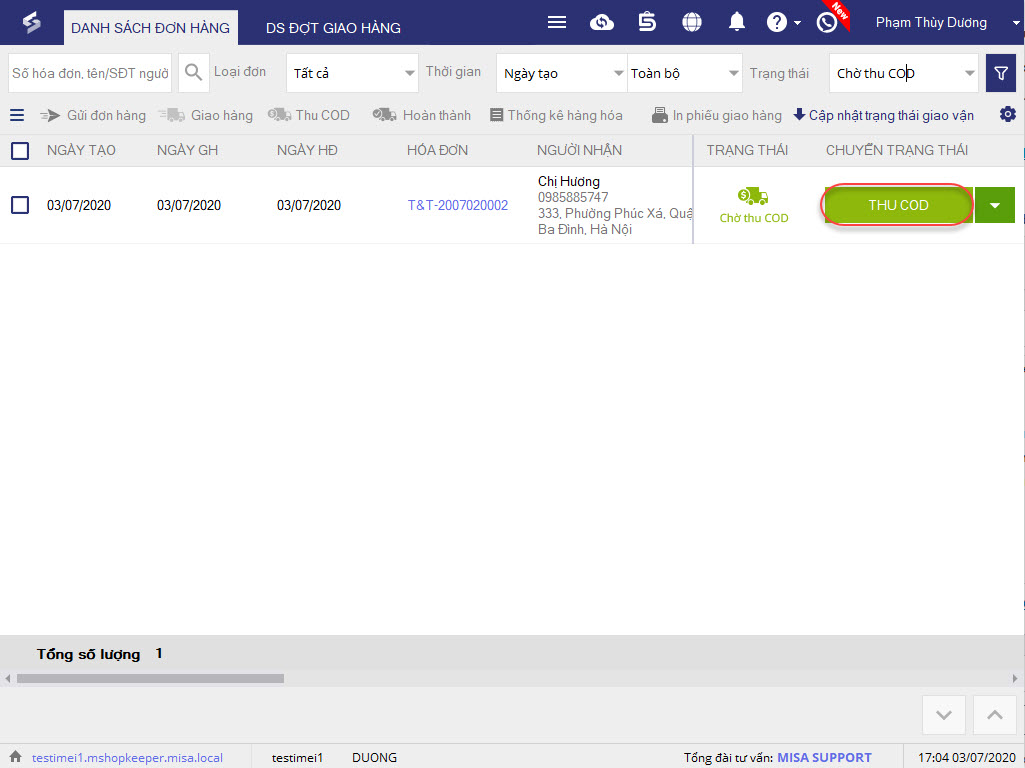 - Với các đơn giao hàng COD, sau khi đối tác chuyển tiền thu hộ cho cửa hàng, nhấn Thu COD trên đơn hàng.