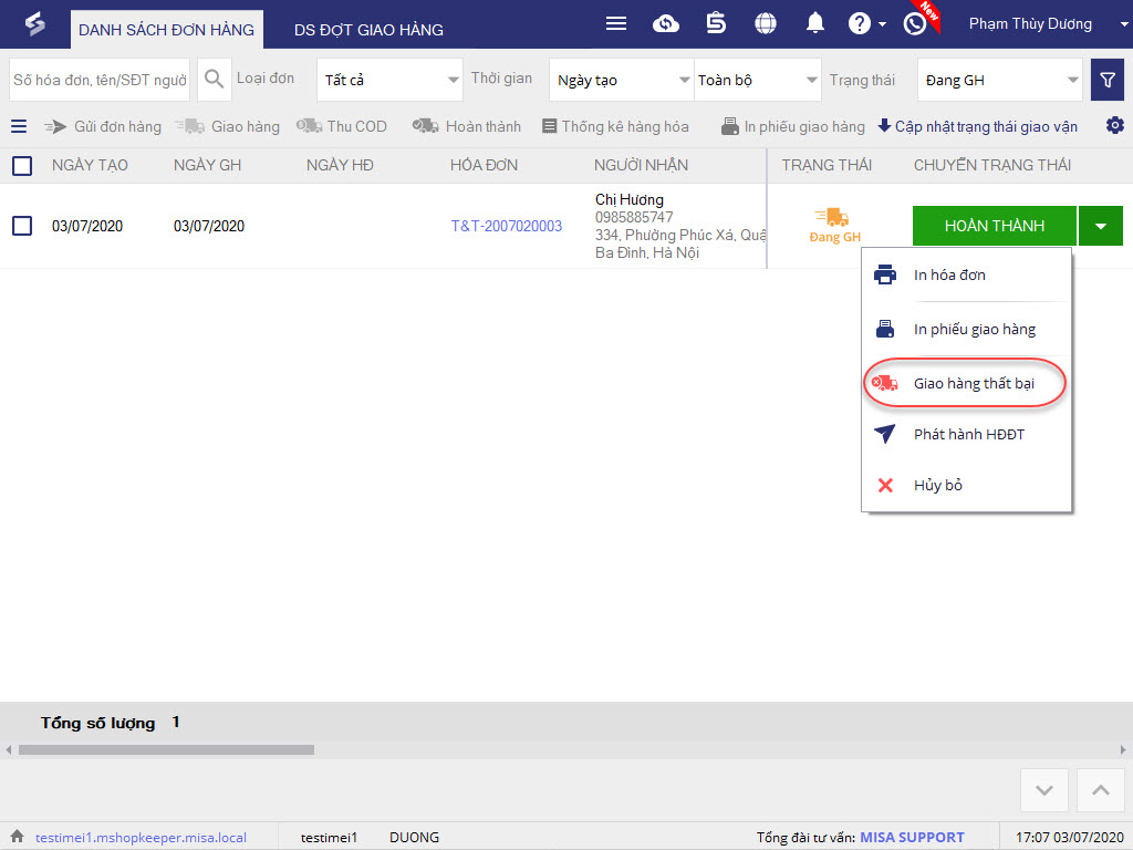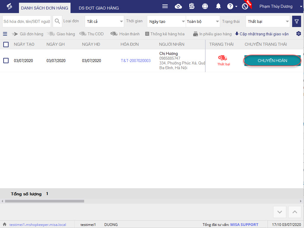 - Khi đó, đơn hàng sẽ chuyển trạng thái Thất bại, nhấn Chuyển hoàn để ghi nhận việc hoàn trả hàng hóa về kho.