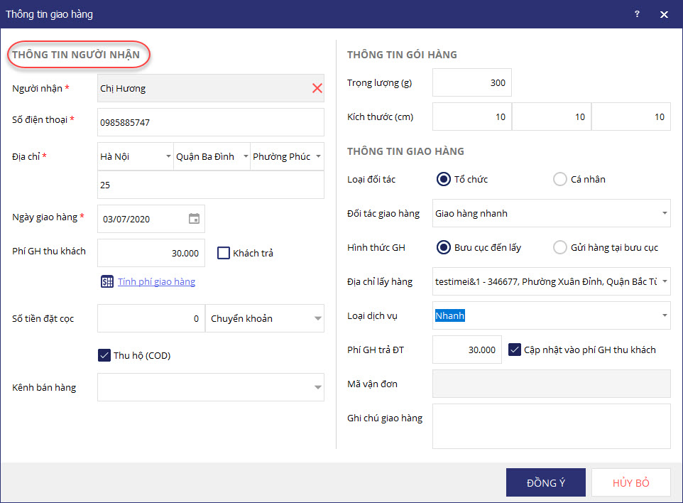 Trường hợp đối tác giao hàng thu tiền khách rồi chuyển về cho cửa hàng, tích chọn thông tin Thu hộ (COD).