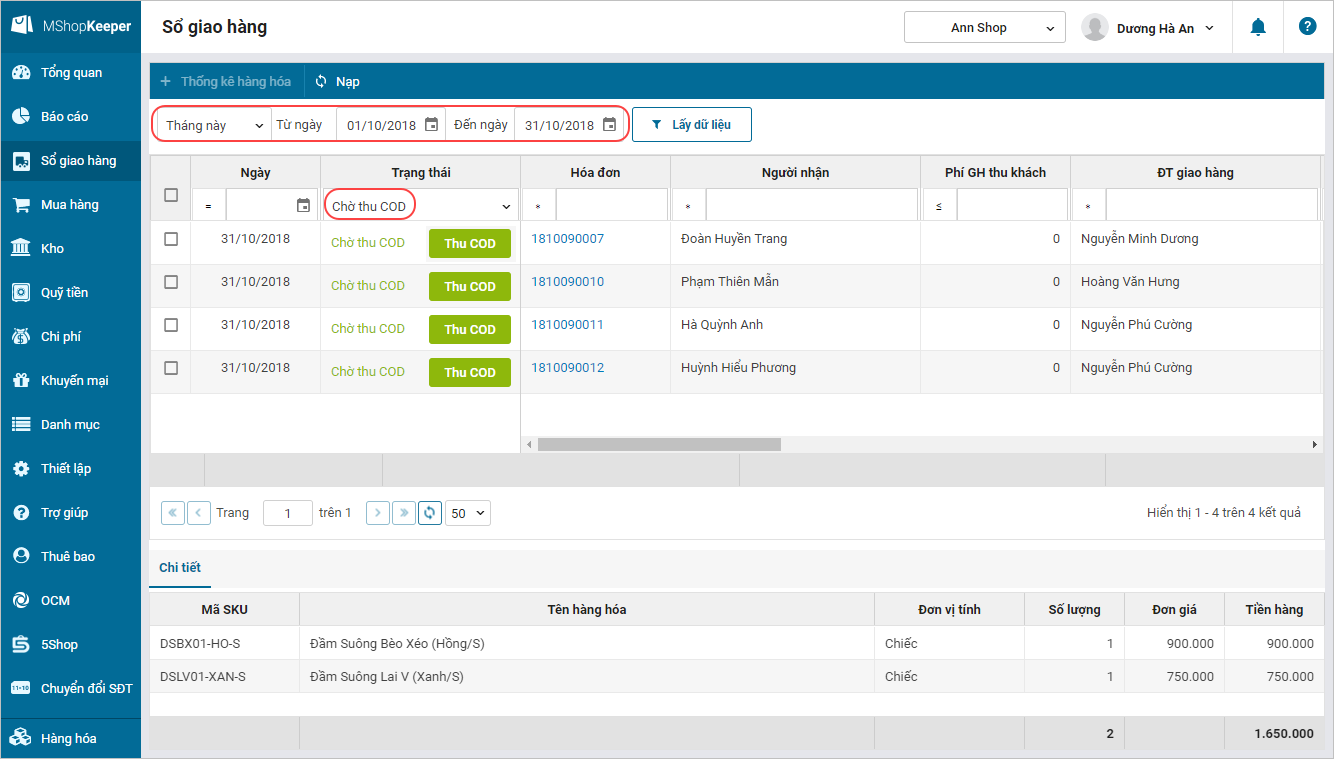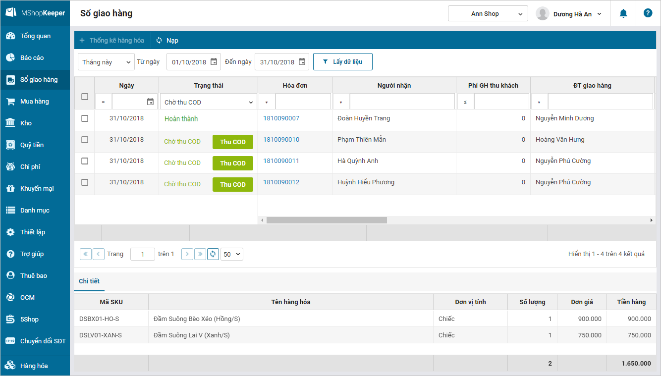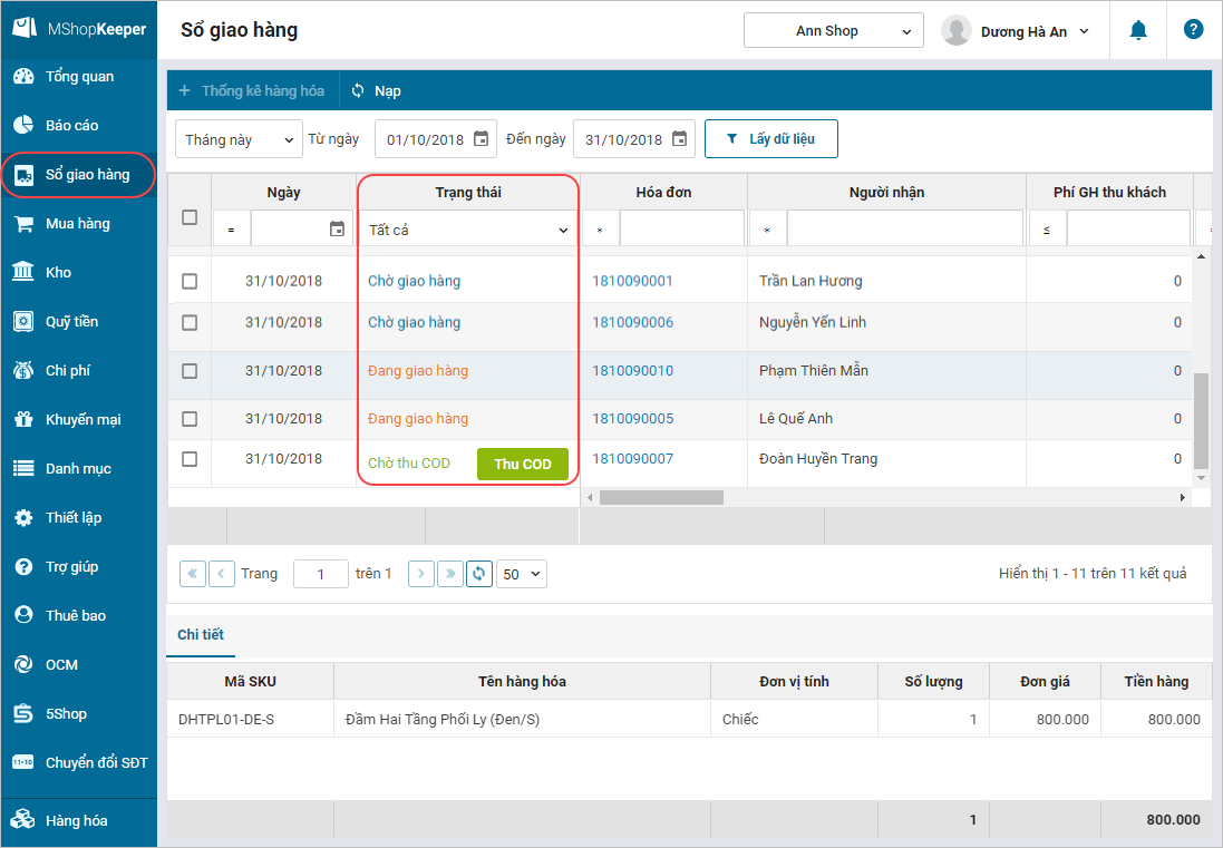 1. Chọn mục Sổ giao hàng. Chương trình đã hiển thị toàn bộ hóa đơn giao hàng tại cửa hàng theo từng trạng thái: Chờ giao hàng, Đang giao hàng, Chờ thu COD, Hoàn thành, Thất bại, Đã chuyển hoàn.