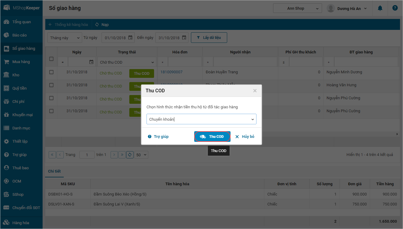 3. Với những đơn hàng Chờ thu COD, Kế toán/Quản lý thực hiện xác nhận đã nhận tiền từ đối tác như sau: