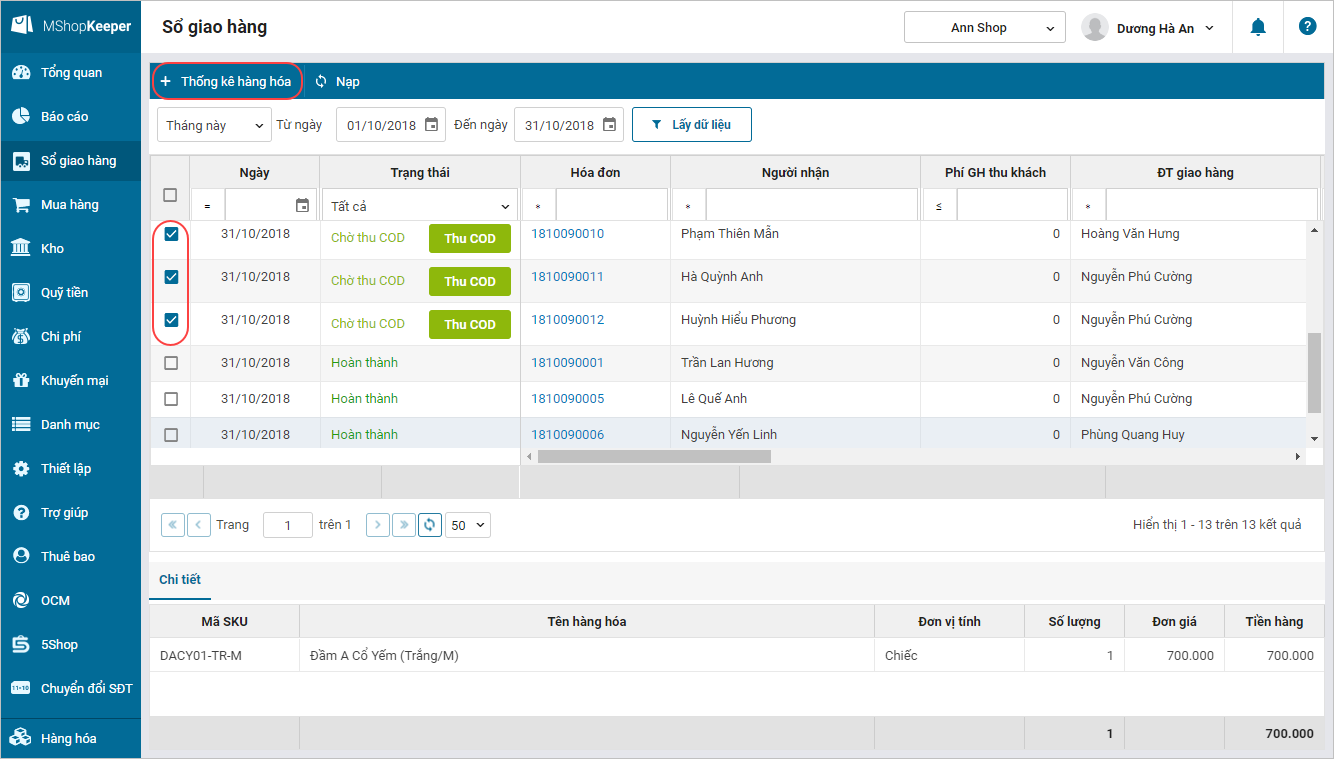 4. Quản lý/kế toán có thể sử dụng chức năng Thống kê hàng hóa để theo dõi số lượng hàng hóa đang chờ giao, đang giao hàng, Chờ thu COD, Chuyển hoàn.