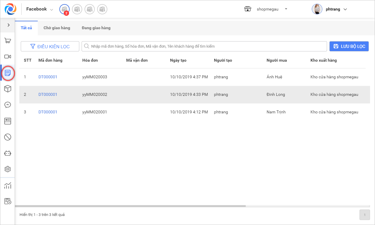 3.1 Nhấn chọn Đơn hàng trên thanh menu, chương trình đã hiển thị toàn bộ đơn giao hàng cho khách được tạo trên OCM trong tab Tất cả