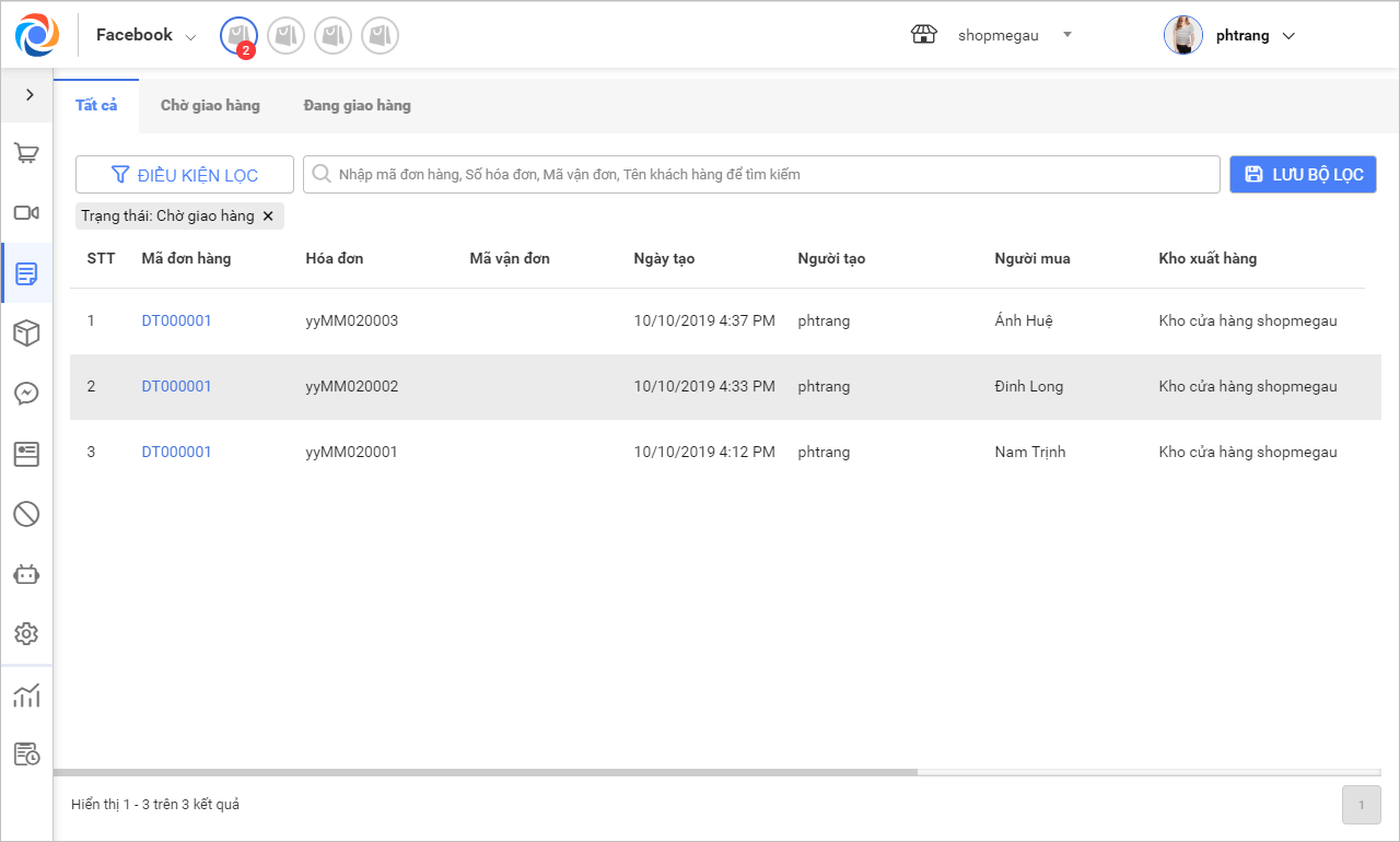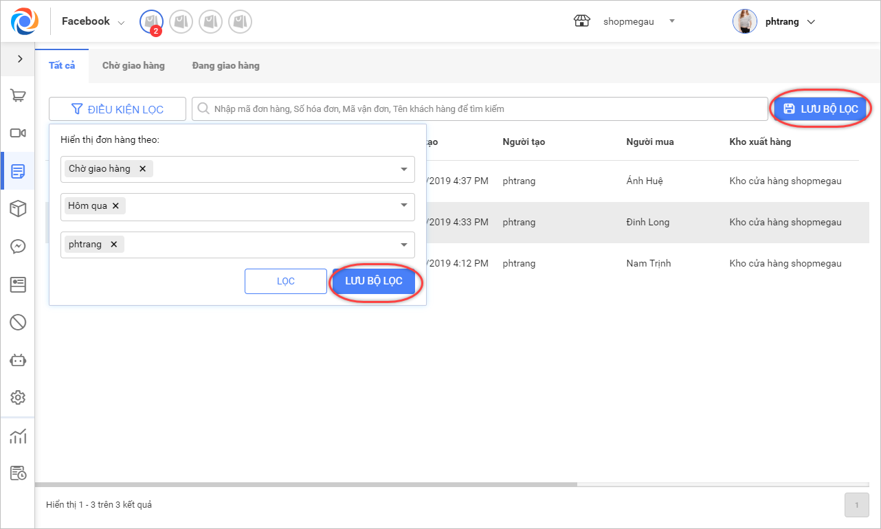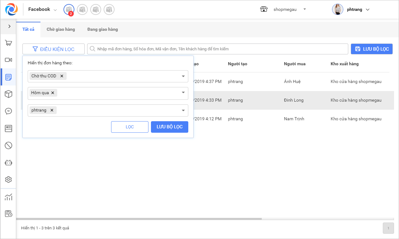 Lưu ý: Chương trình đang tạo sẵn 2 tab Chờ giao hàng và Đang giao hàng để tiện theo dõi. Ngoài ra có thể lọc thêm các tiêu chí và lưu lại bộ lọc để tiện sử dụng