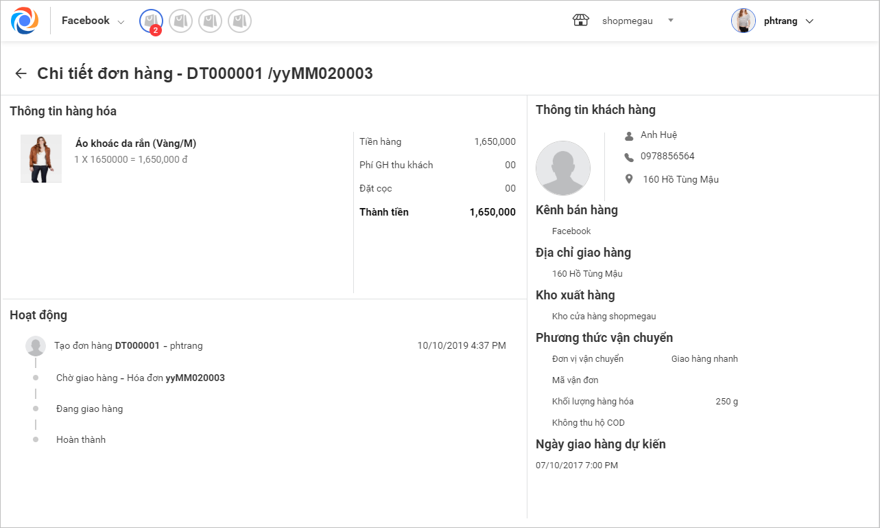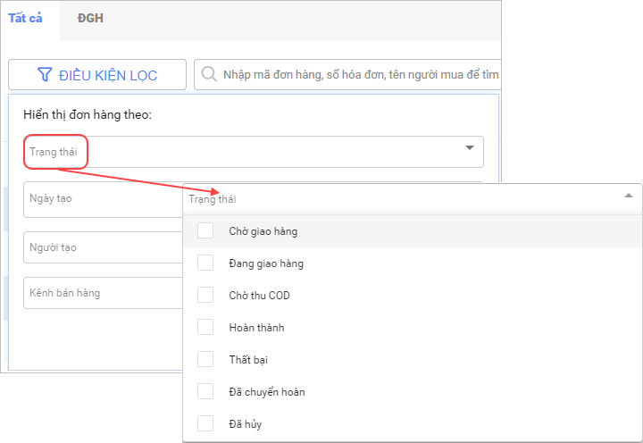 Giúp nhân viên bán hàng Online theo dõi trạng thái các đơn hàng: Chờ giao hàng, Đang giao hàng, Hoàn thành, Thất bại,…
