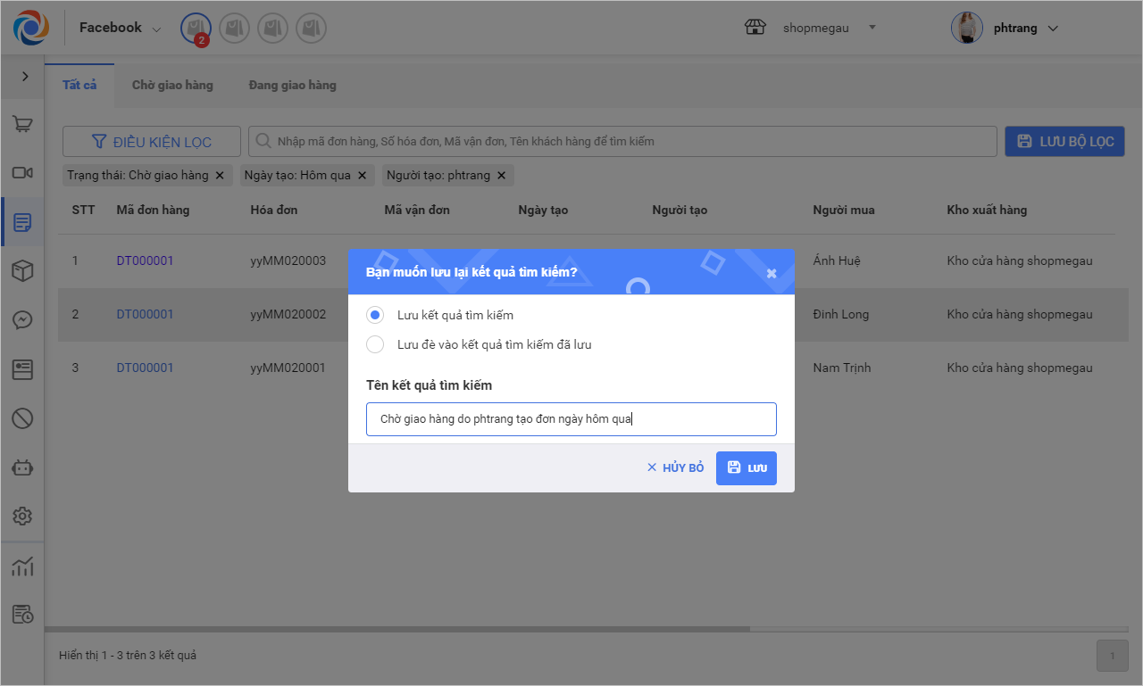 – Bộ lọc tìm kiếm được lưu sẽ hiển thị dưới dạng tab bên cạnh các tab Tất cả, Chờ giao hàng, Đang giao hàng.