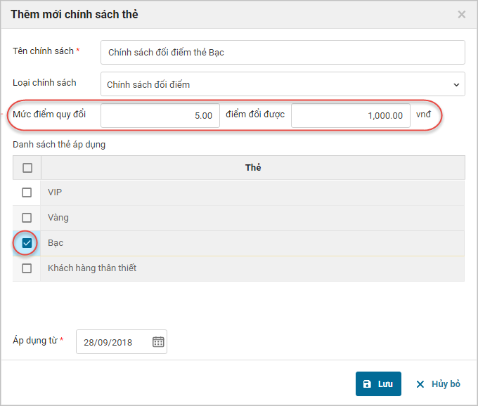 5. Nhập mức điểm quy đổi và tích chọn Danh sách hạng thẻ áp dụng.