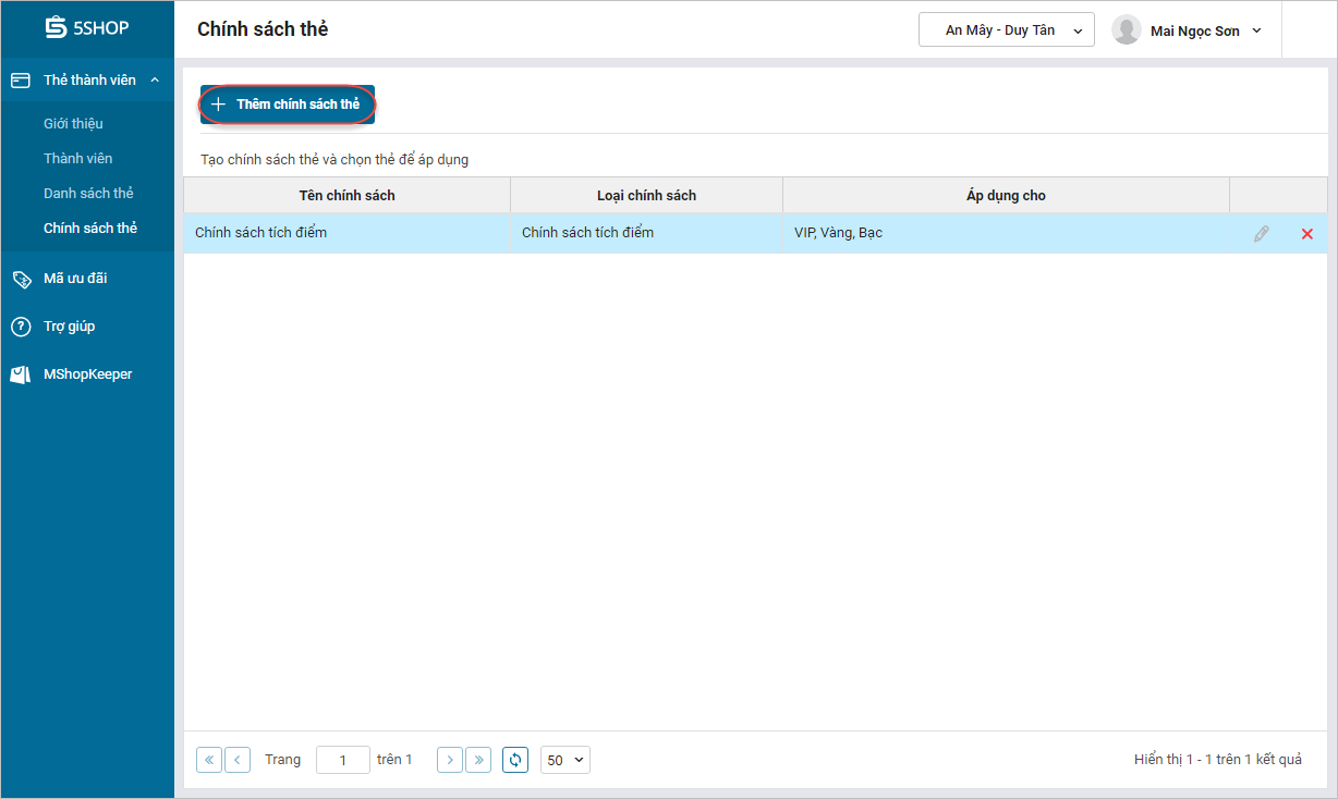 1. Nhấn chọn Thẻ thành viên\Chính sách thẻ.