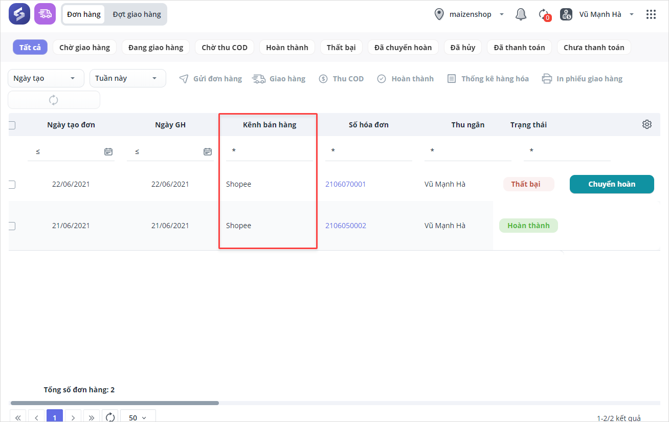 Nhấn vào kênh bán hàng để xem chi tết đơn hàng.
