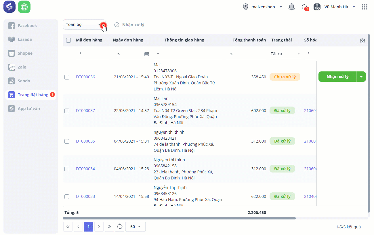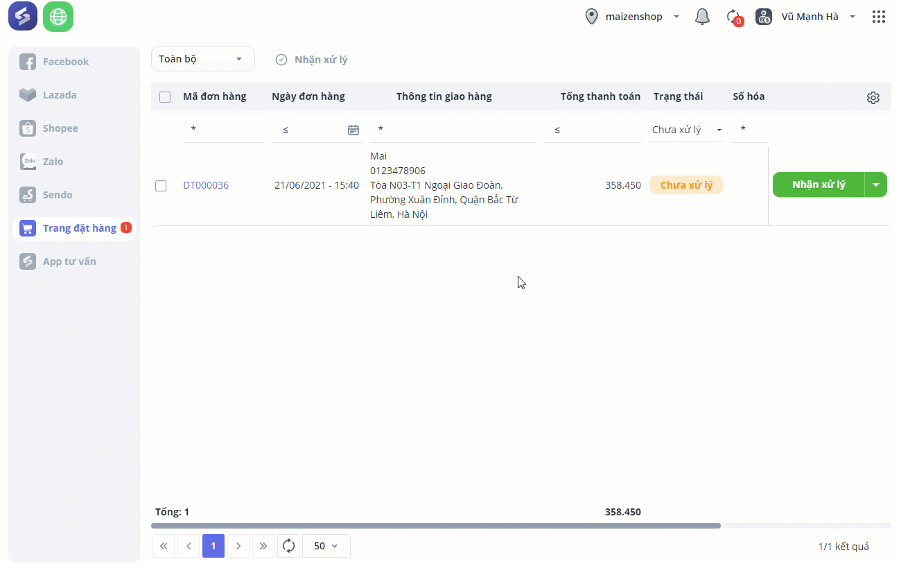 Sau đó, nhấn Nhận xử lý và giao hàng cho khách.