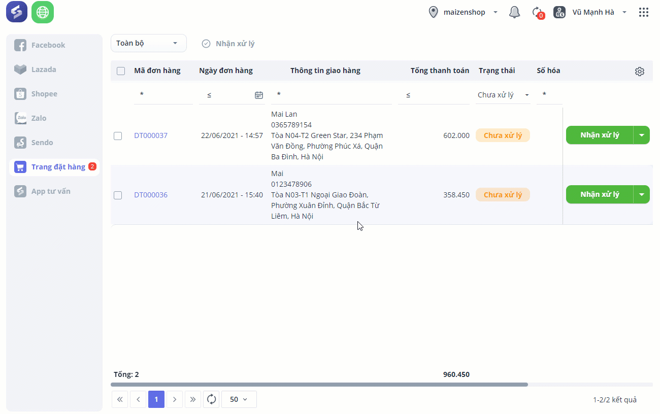 Cửa hàng có thể lọc danh sách đơn hàng theo trạng thái Chưa xử lý/Đã xử lý/Đã hủy để tiện theo dõi.