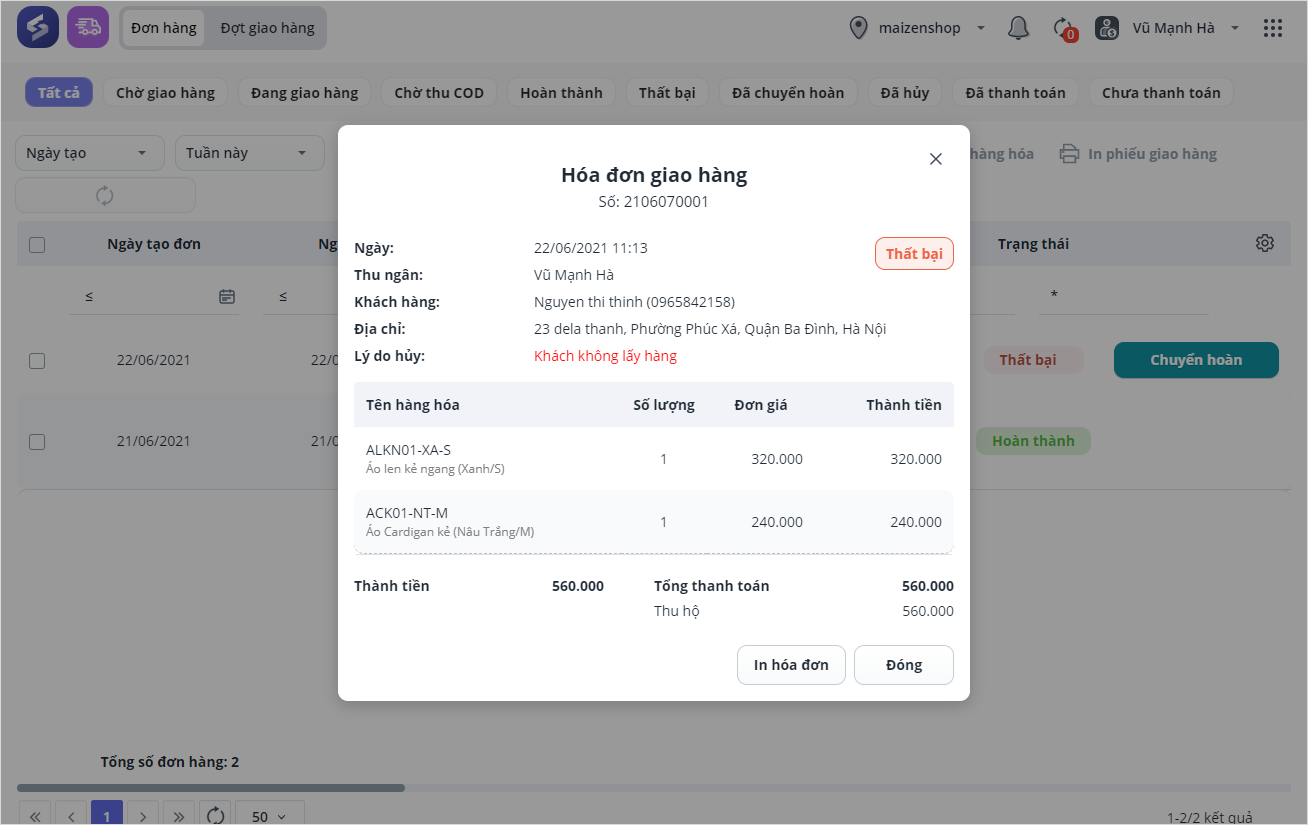 • Nhấn vào Số hóa đơn để xem chi tiết đơn giao hàng.