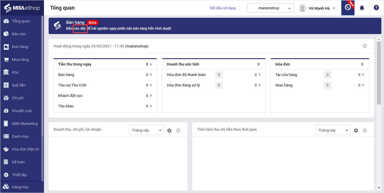 Bước 1: Trên trang quản lý, bấm vào Bán hàng Beta.