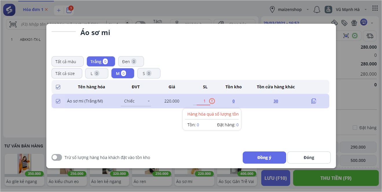 Trường hợp hàng hóa đã chọn vượt quá số lượng tồn, chương trình hiển thị cảnh báo như ảnh dưới đây.