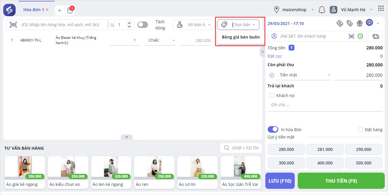 Bước 5: Nếu cửa hàng áp dụng bảng giá khác nhau cho từng khách hàng (khách lẻ, khách buôn, khách quen,…), nhân viên thu ngân nhấn chọn bảng giá.