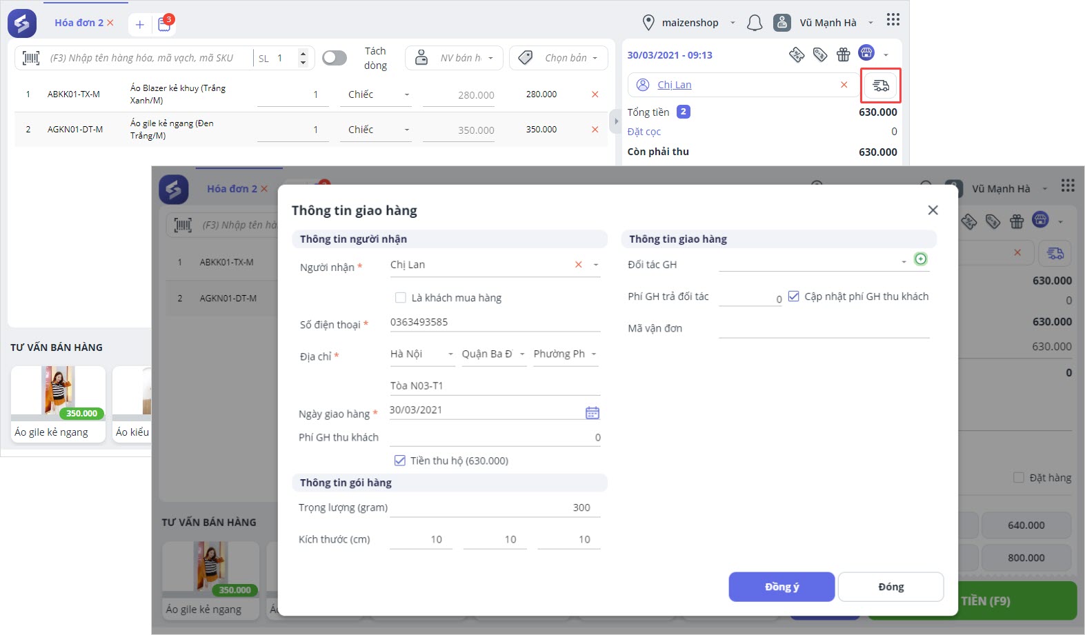 Lưu ý: Trường hợp khách yêu cầu giao hàng tận nhà, nhận viên nhấn vào biểu tượng điền thông tin người nhận, nhấn Đồng ý.