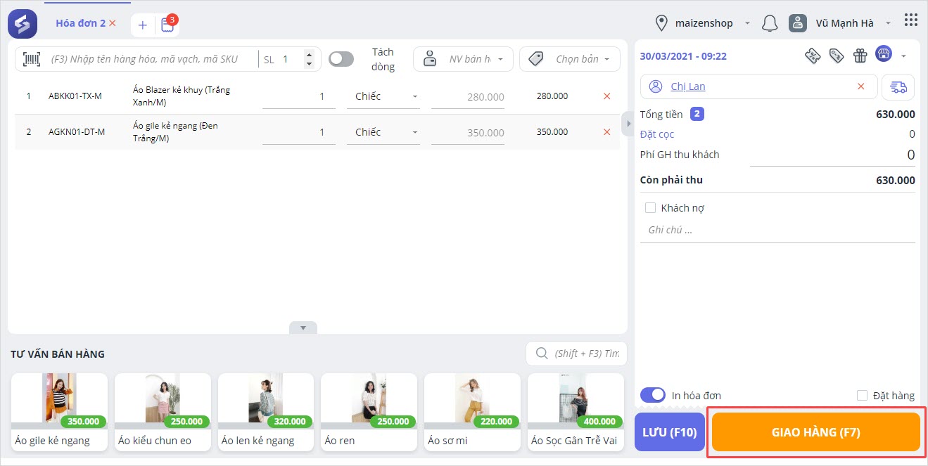 Bước 2: Tìm kiếm hàng hóa (F3) theo tên, mã vạch, mã SKU, theo dõi số lượng tồn kho thực tế và số lượng hàng khách đặt để tư vấn/thanh toán cho khách.