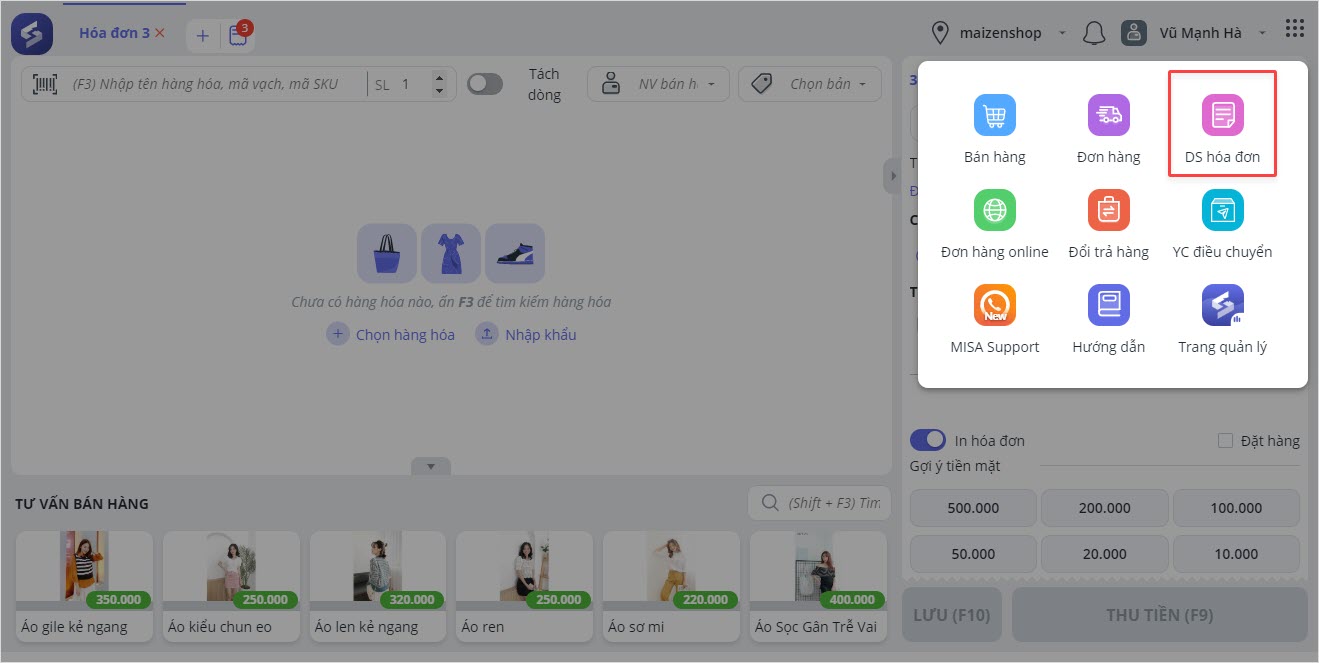 • Để xem lại/chỉnh sửa hóa đơn bán tại cửa hàng, thu ngân nhấn vào DS hóa đơn.