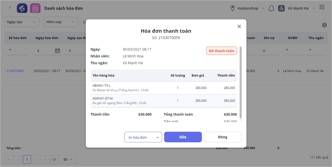• Trong chi tiết hóa đơn, thu ngân có thể In hóa đơn/Hủy hóa đơn/Nhân bản.
