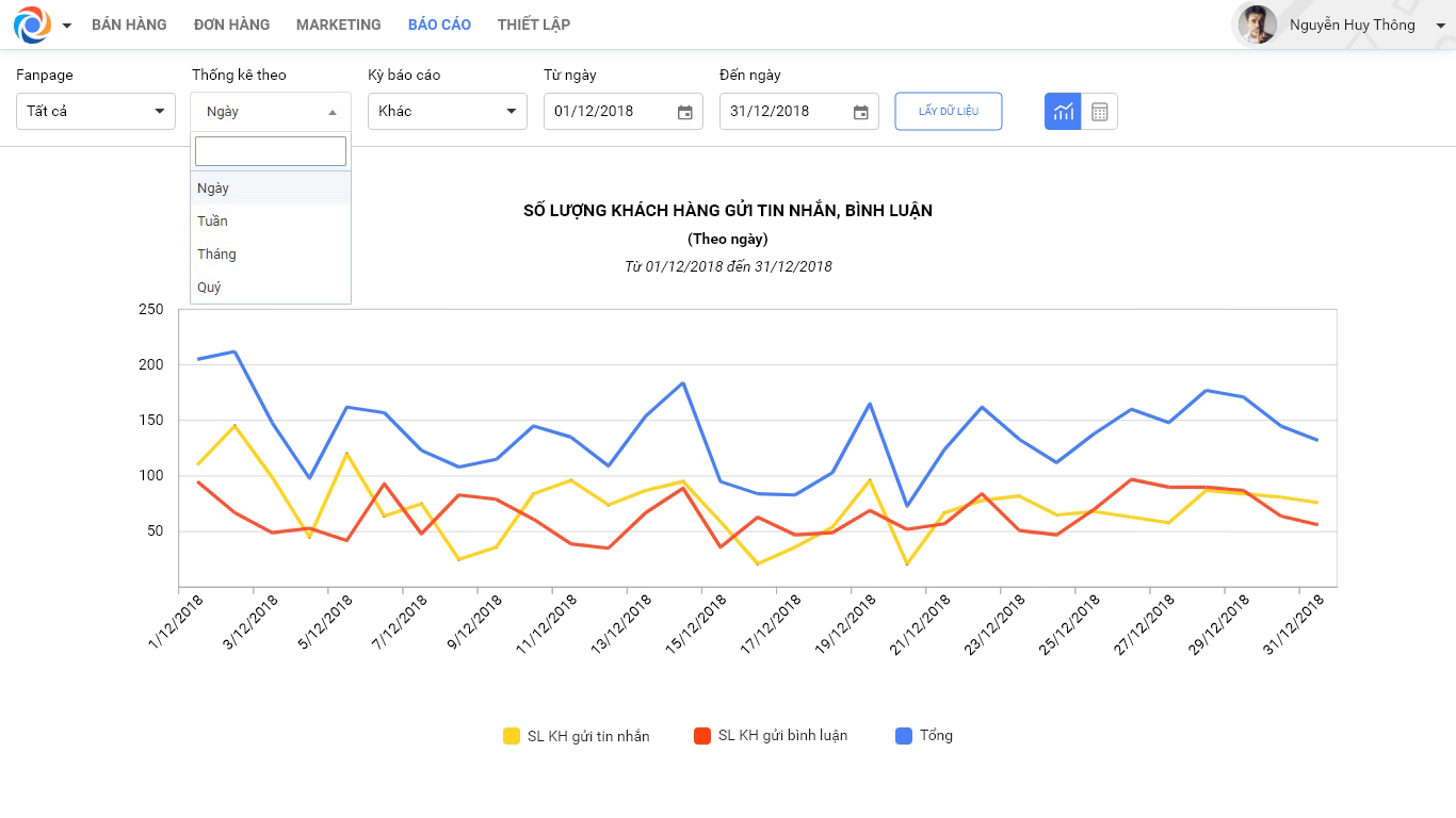 5. Chương trình mặc định thống kê số lượng tin nhắn, bình luận theo ngày. Có thể chọn Thống kê theo Tuần, Tháng, Quý.