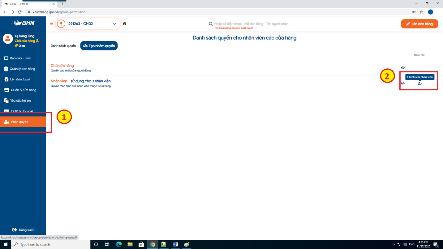 Bước 2: Truy cập đường dẫn https://khachhang.ghn.vn, thực hiện đăng nhập vào tài khoản GHN của cửa hàng, chọn mục Phân quyền, nhấn Chỉnh sửa nhân viên: