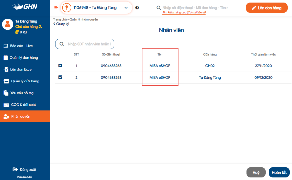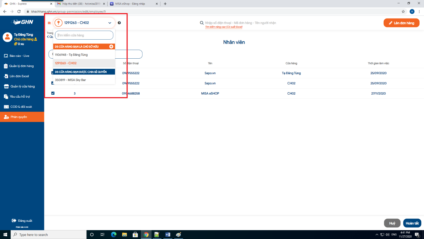 Tại danh sách nhân viên: chọn phân quyền cho MISA eShop.