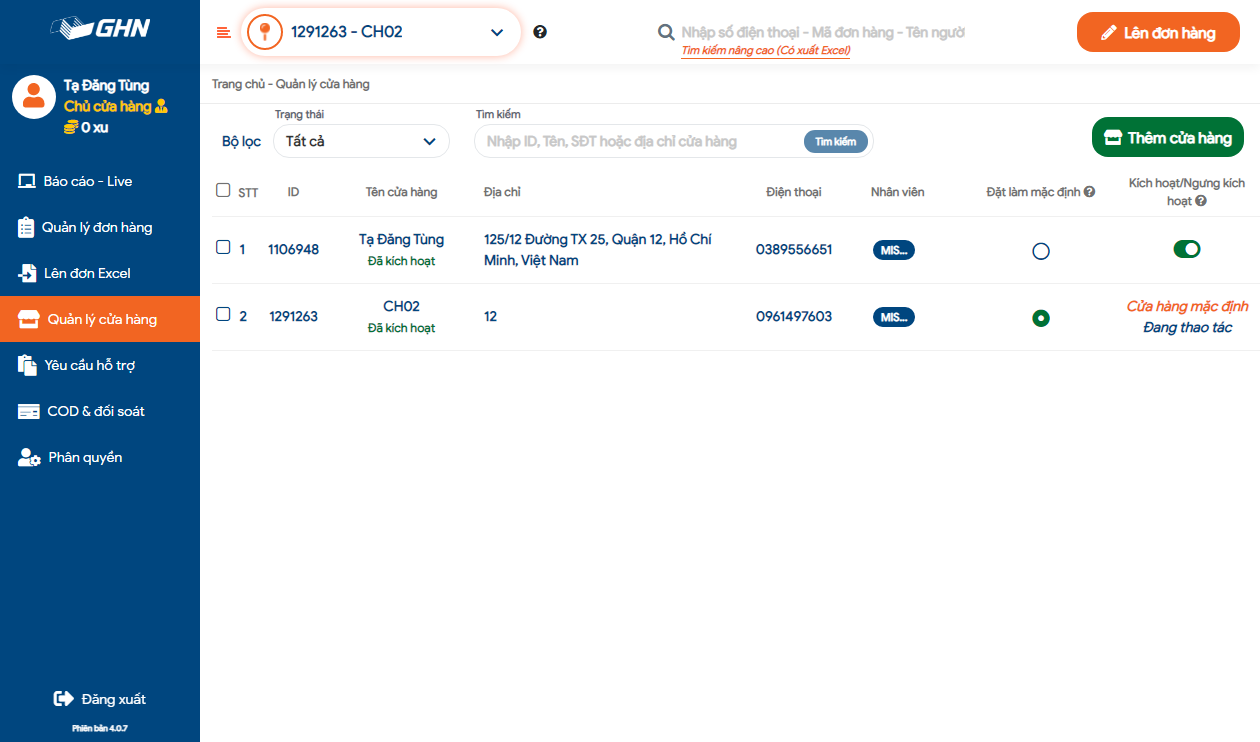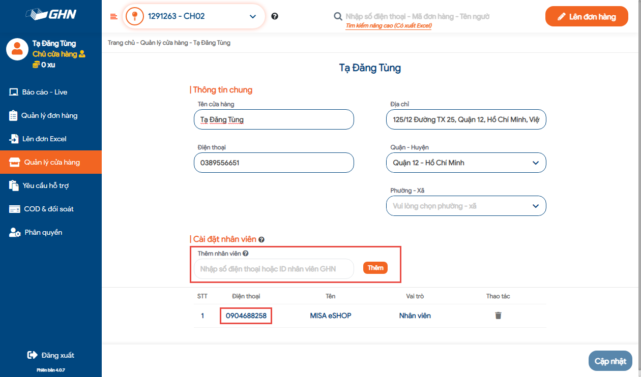 - Vào Quản lý cửa hàng, chọn Tên cửa hàng.