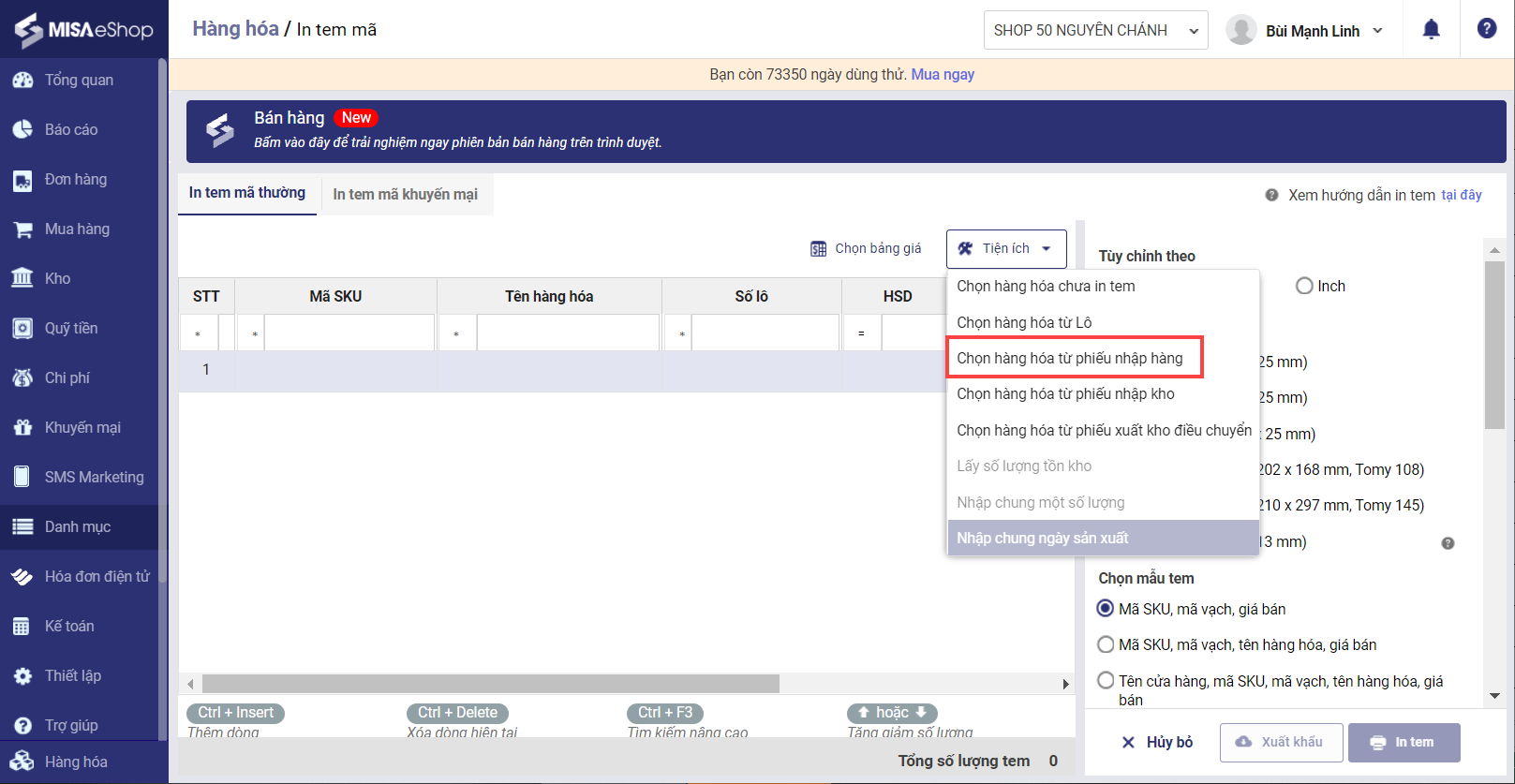 Sau khi nhập hàng, quản lý có thể chọn và in nhanh tem mã cho hàng hóa, thao tác thực hiện như sau: