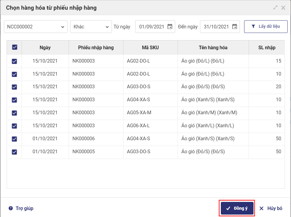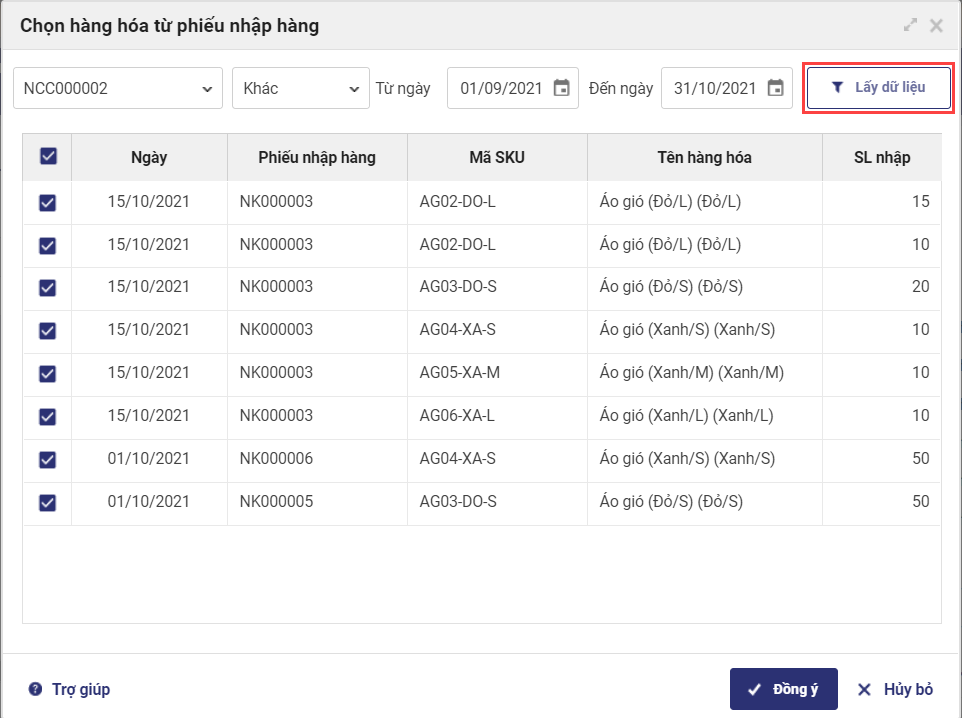- Chọn thời gian nhập hàng, nhấn Lấy dữ liệu.