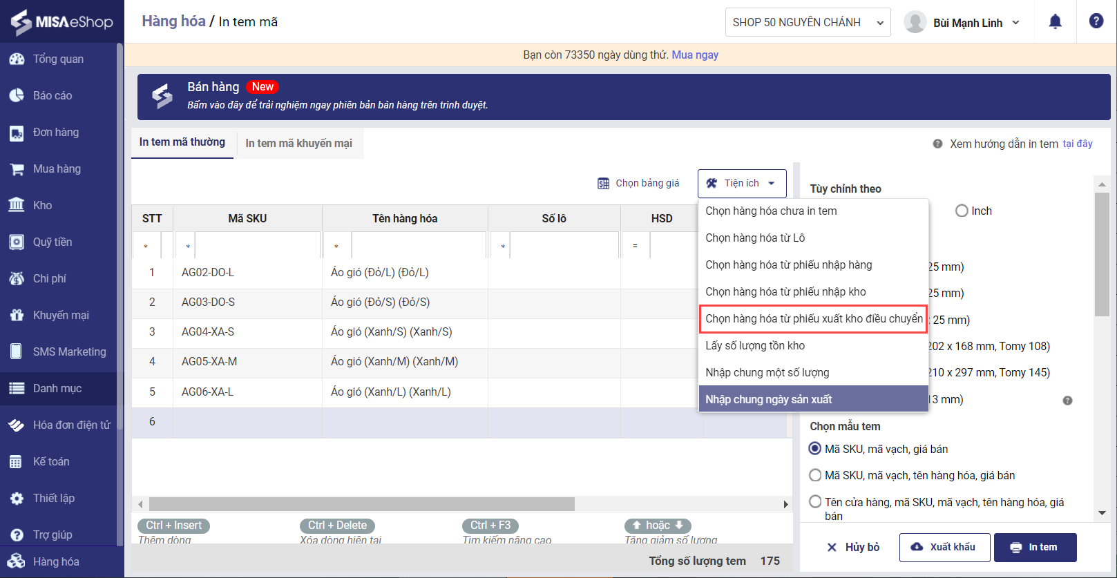 Trường hợp chuỗi cửa hàng in tem mã cho hàng hóa tại kho tổng, sau đó mới vận chuyển về các chi nhánh, có thể thực hiện lập phiếu xuất kho điều chuyển, sau đó in tem toàn bộ hàng hóa xuất kho như sau: