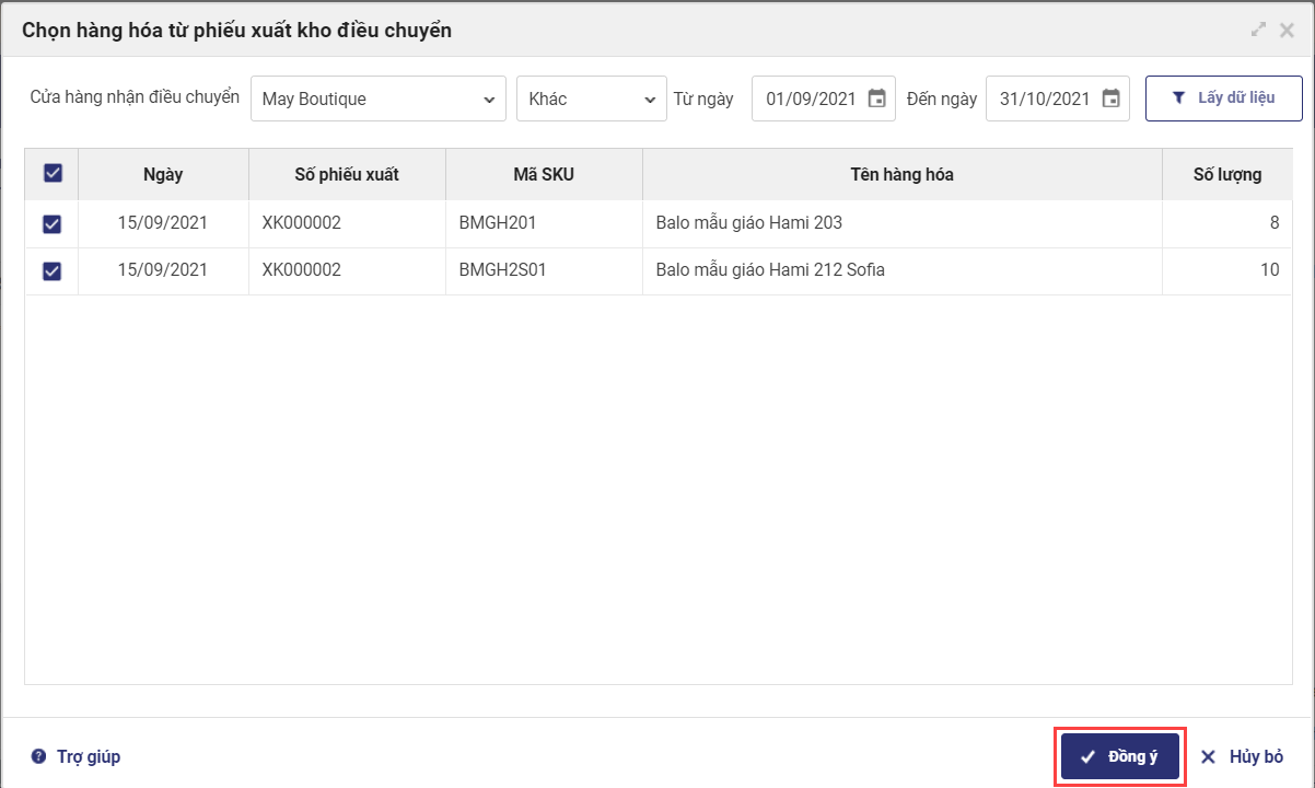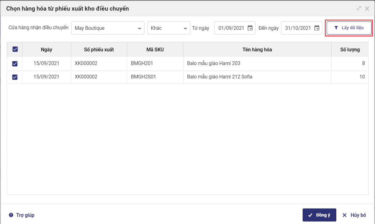 - Chọn thời gian lập phiếu điều chuyển, nhấn Lấy dữ liệu.