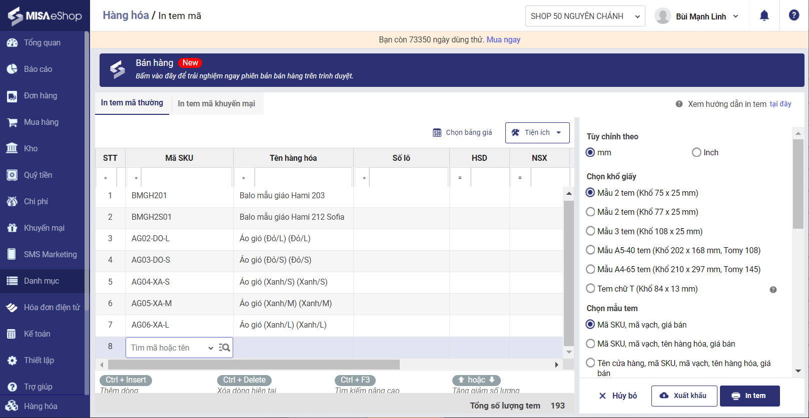 - Thực hiện in tem mã hàng hóa. Tham khảo hướng dẫn in tem tại đây.