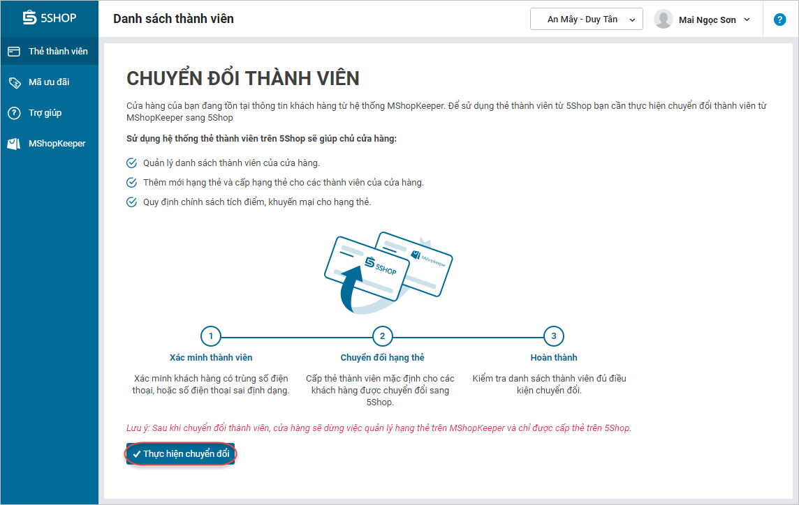 Với lần đầu sử dụng 5Shop, Quản lý cửa hàng thực hiện chuyển đổi danh sách thành viên từ MShopKeeper sang 5Shop theo 1 trong 2 trường hợp: