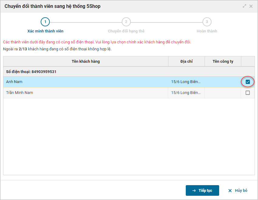 3. Tại bước Xác minh thành viên. Trường hợp danh sách có khách hàng trùng số điện thoại, cần lựa chọn chính xác thông tin khách hàng để chuyển đổi.