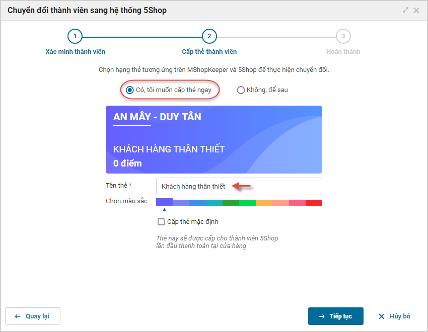 - Khai báo tên và chọn màu sắc thẻ thành viên.