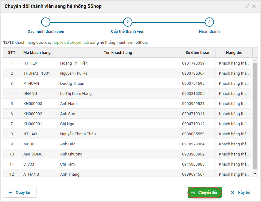 7. Nhấn Chuyển đổi để chuyển thông tin khách hàng sang 5Shop.