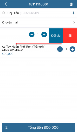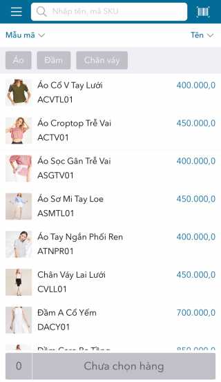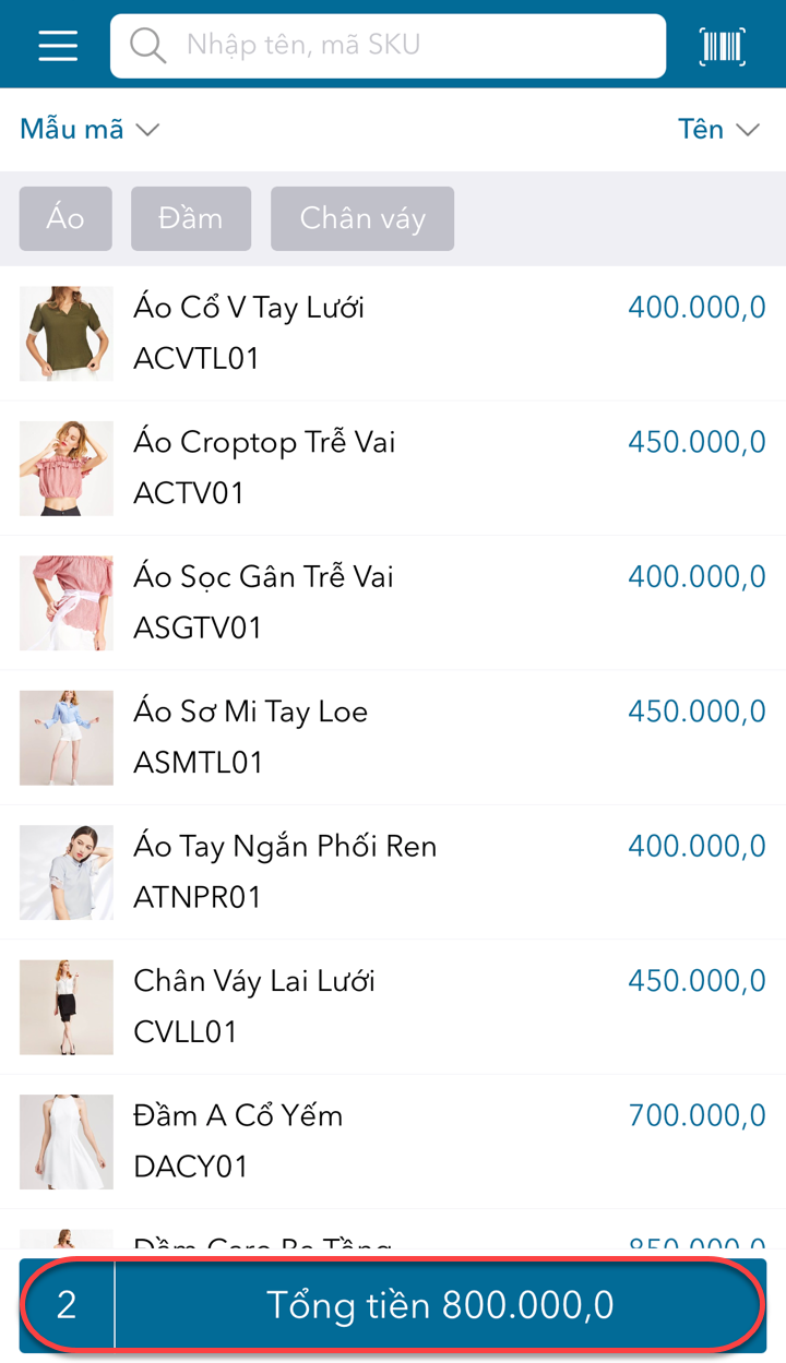 - Nhấn biểu tượng để quay lại danh sách hàng hóa và chọn hàng hóa mới khách muốn mua.