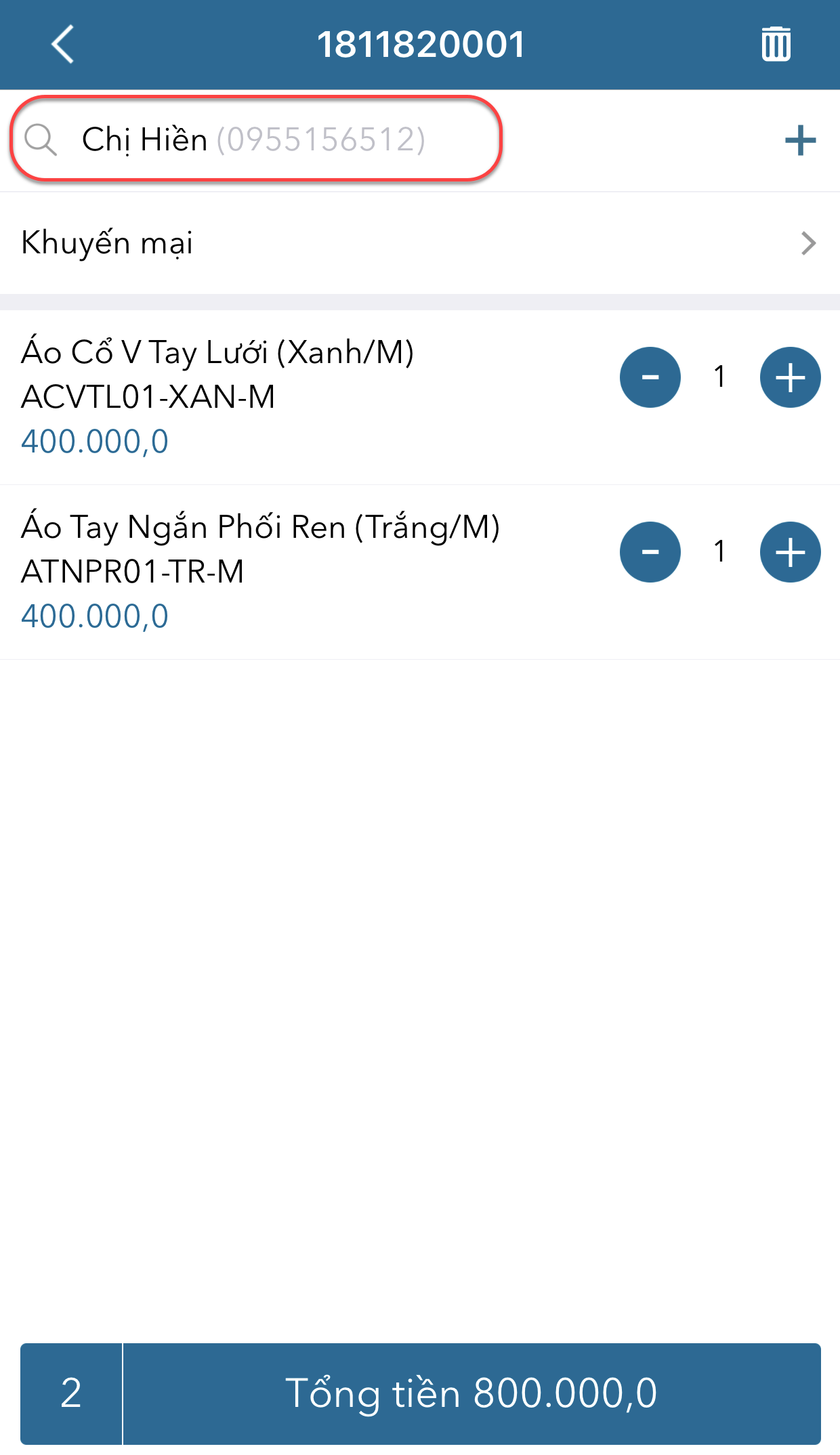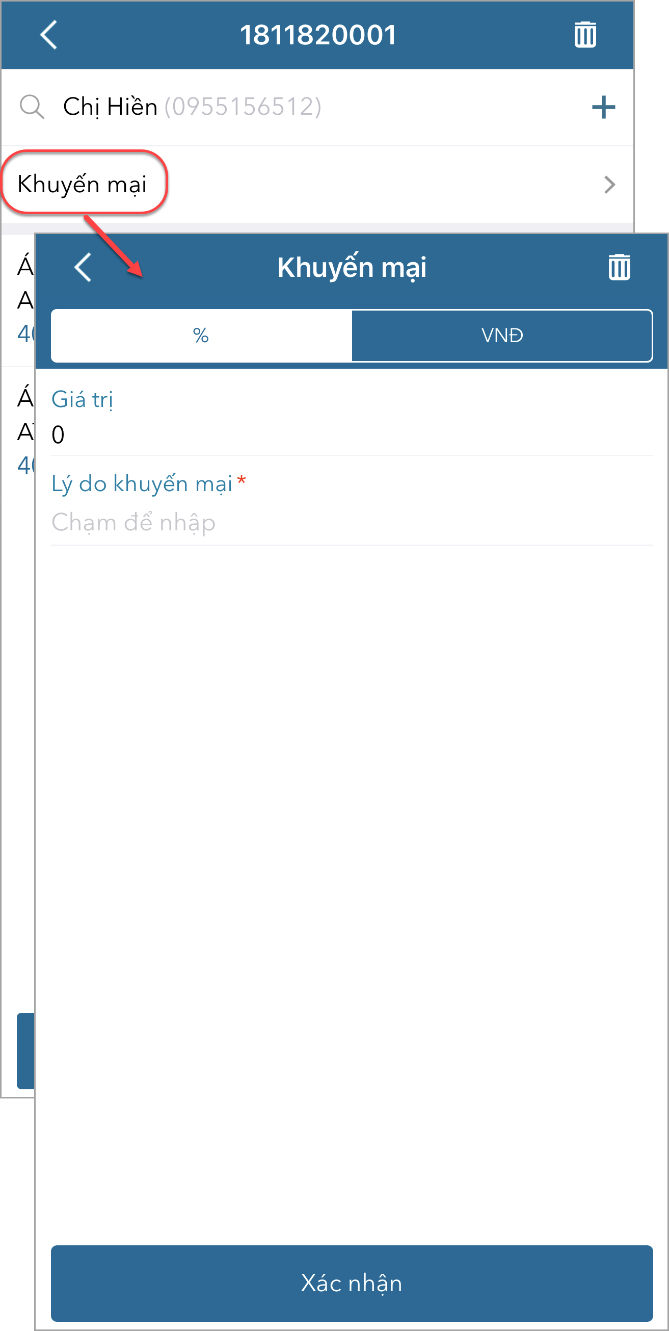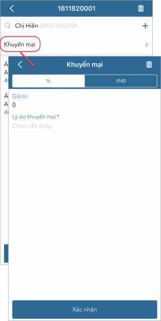 - Nếu khách hàng được hưởng chương trình khuyến mại của cửa hàng, nhấn Khuyến mại để ghi nhận cho khách.