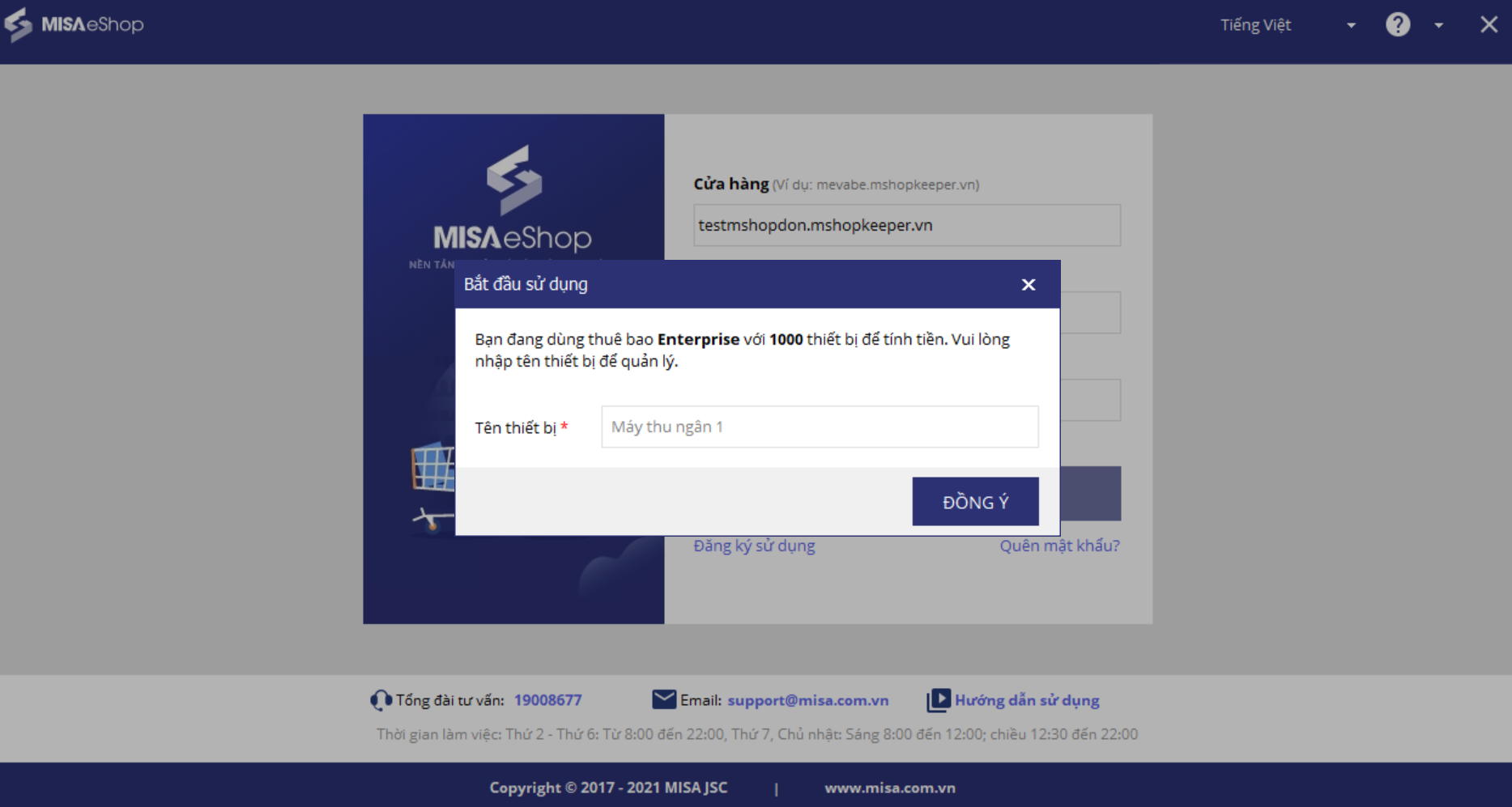 1. Khi đăng nhập vào phần mềm bán hàng MISA eShop, tại màn hình Bắt đầu sử dụng, nhập tên thiết bị.