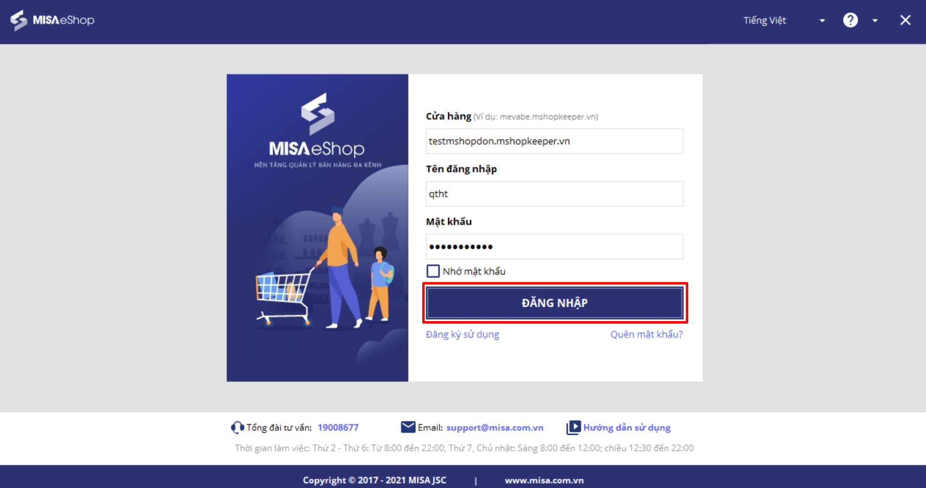 Đối với lần đầu đăng nhập vào phần mềm MISA eShop, cần thực hiện đăng ký thiết bị bán hàng, thao tác thực hiện như sau: