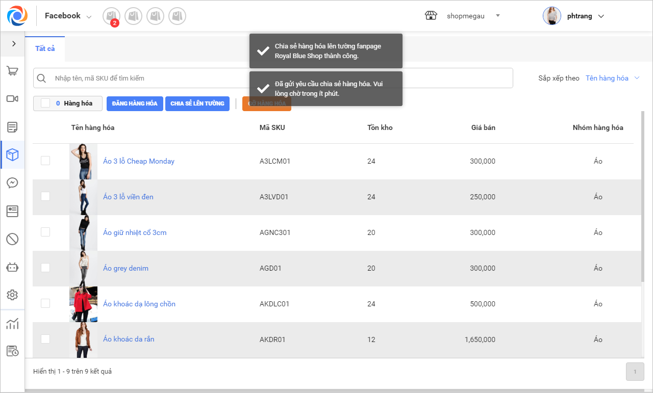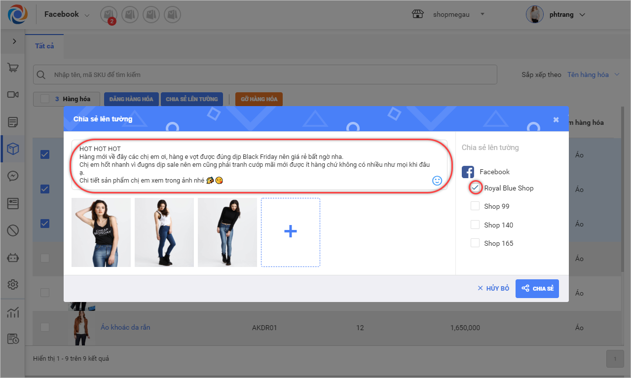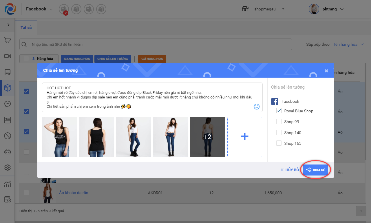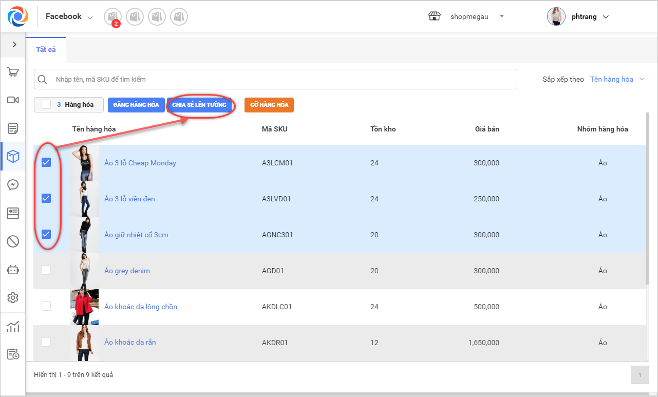 1. Tích chọn các sản phẩm muốn chia sẻ lên tường Fanpage, nhấn Chia sẻ lên tường.