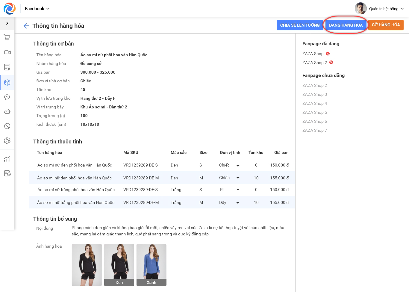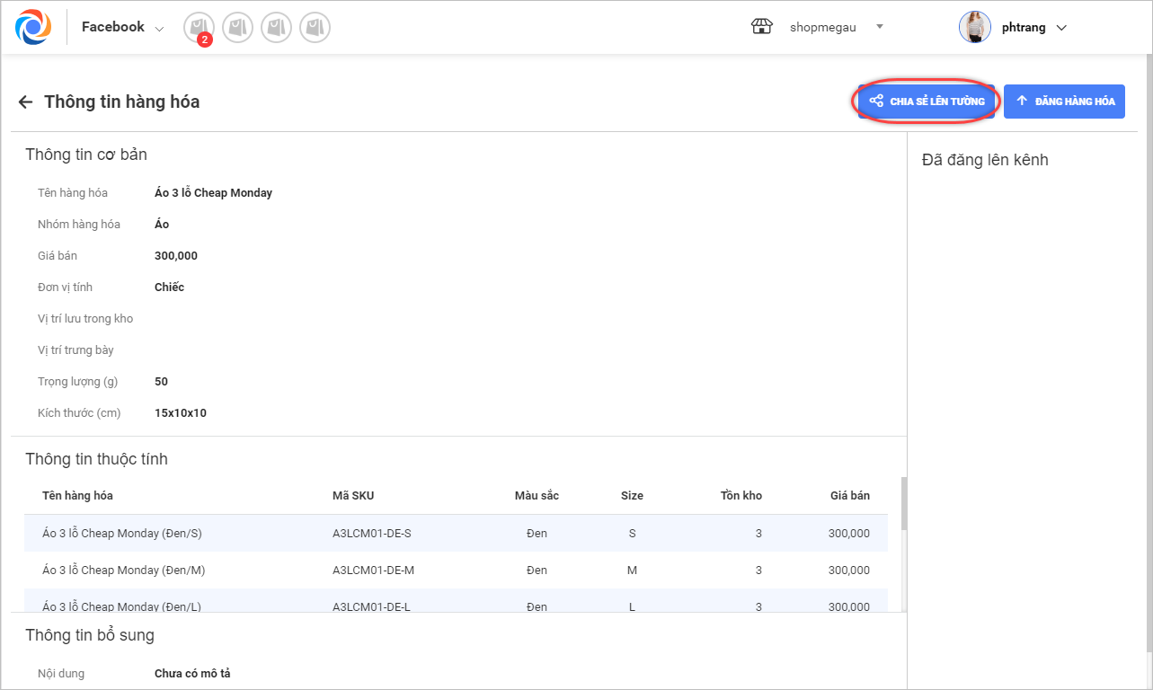 4. Ngoài ra, khi xem chi tiết thông tin sản phẩm cũng có thể thực hiện đăng sản phẩm lên Cửa hàng trên Fanpage.