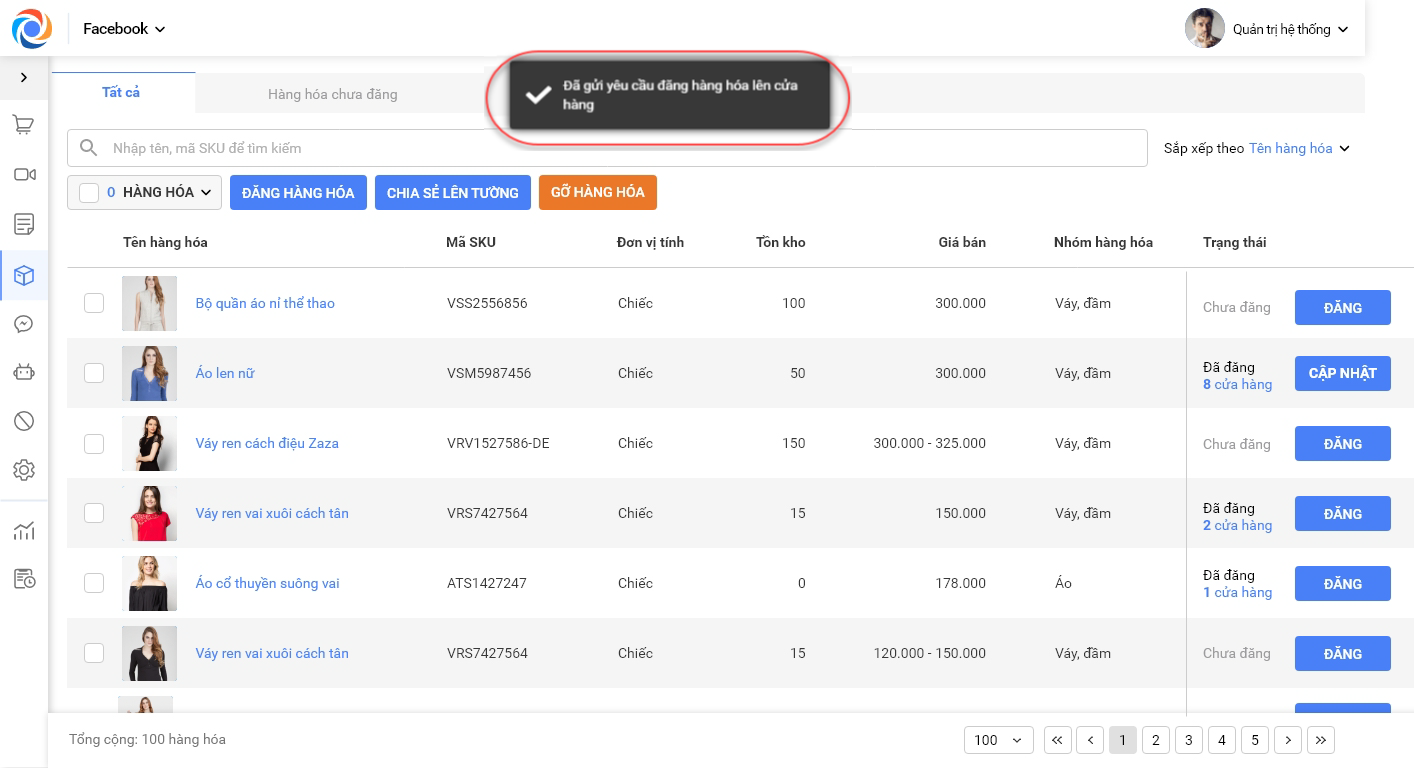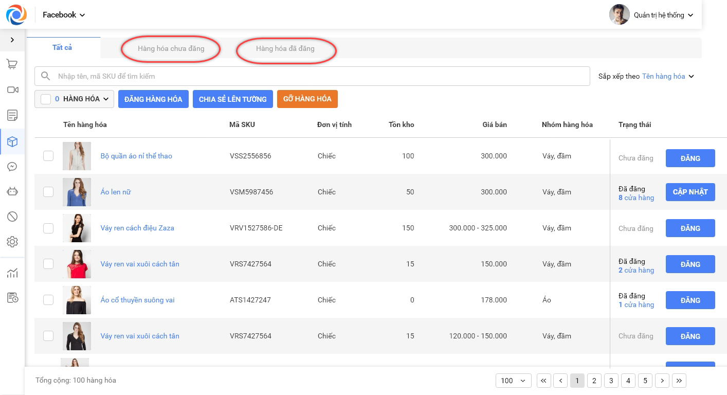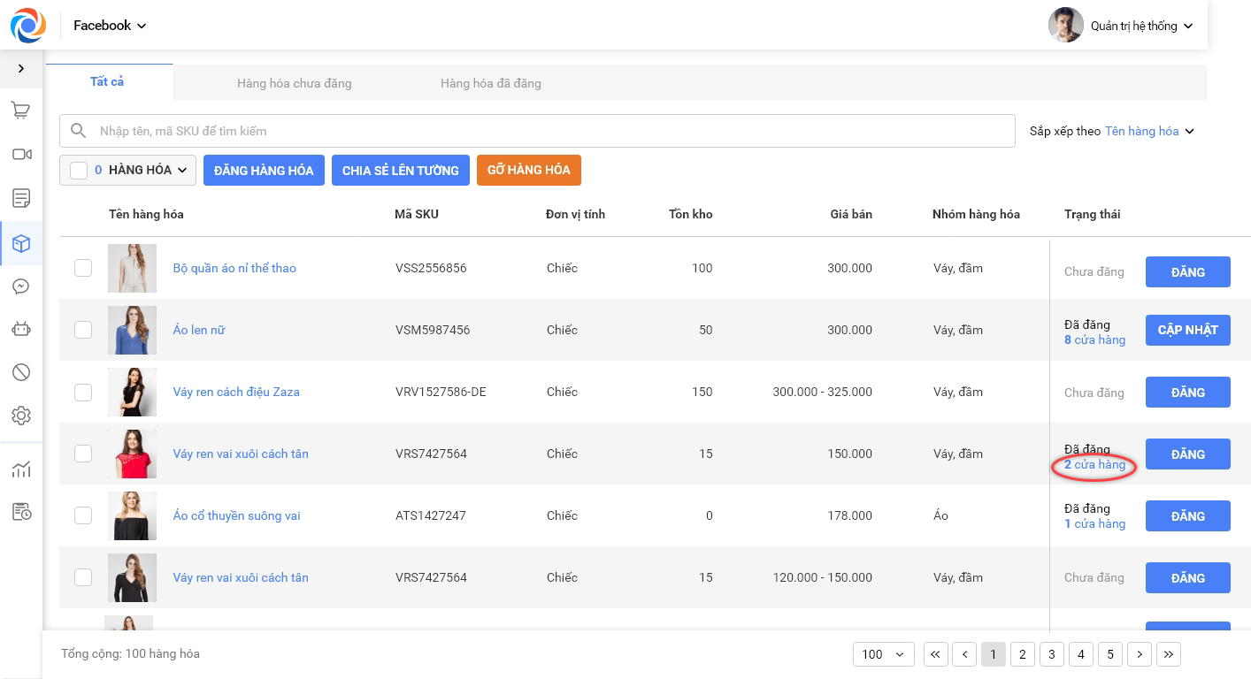 – Trong tab Tất cả, các hàng hóa sẽ hiển thị trạng thái chưa đăng/đã đăng. Đối với các hàng hóa đã đăng, có thể xem hàng hóa đã được đăng lên bao nhiêu Fanpage