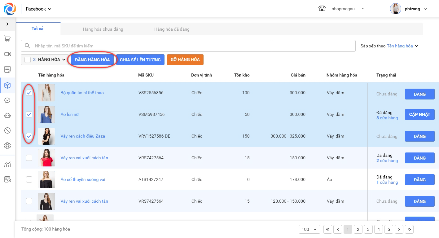 1. Tích chọn các sản phẩm muốn đăng lên Cửa hàng, nhấn Đăng hàng hóa.